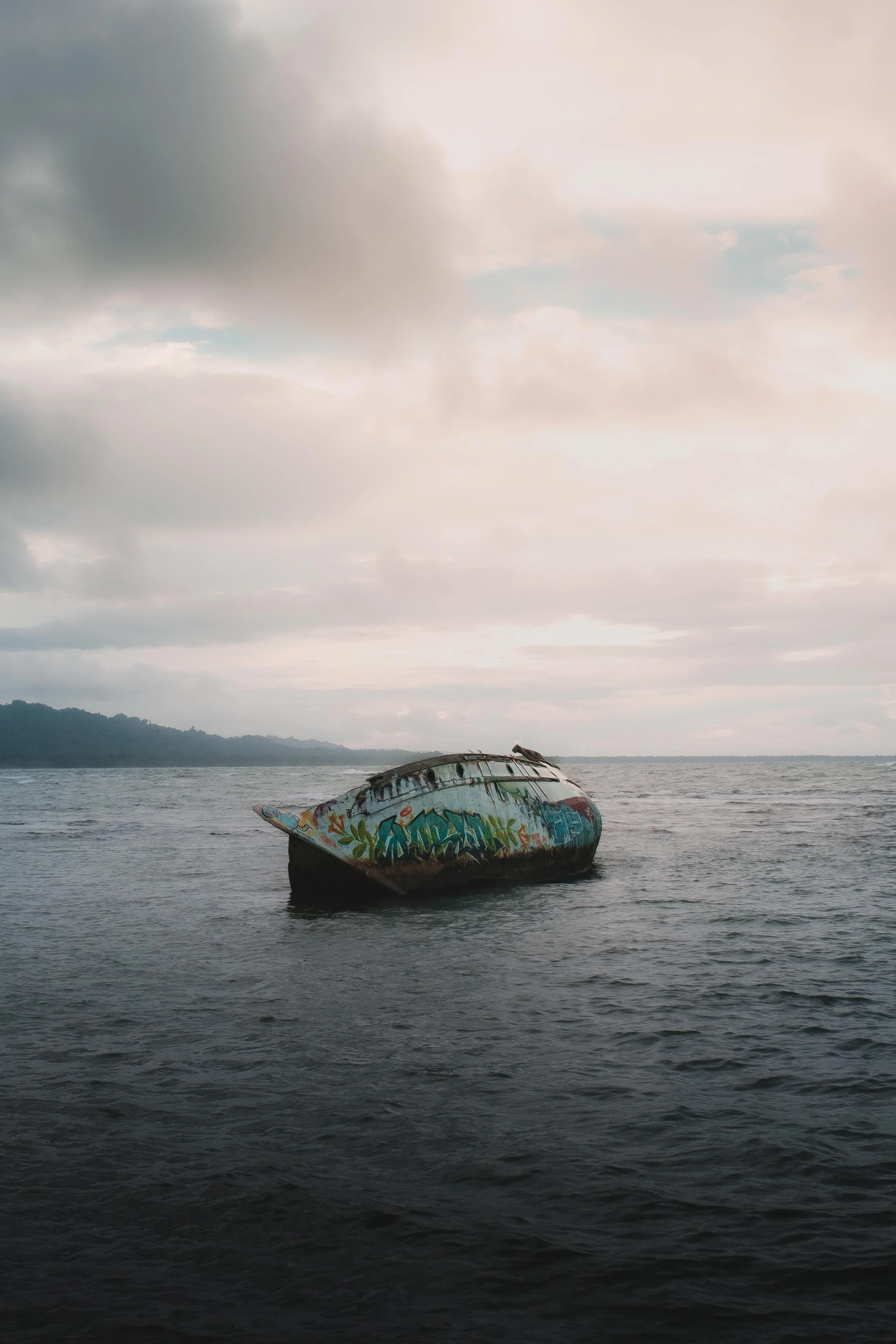 A rusted boat with graffiti, partially submerged in water with cloudy sky and distant shoreline.
