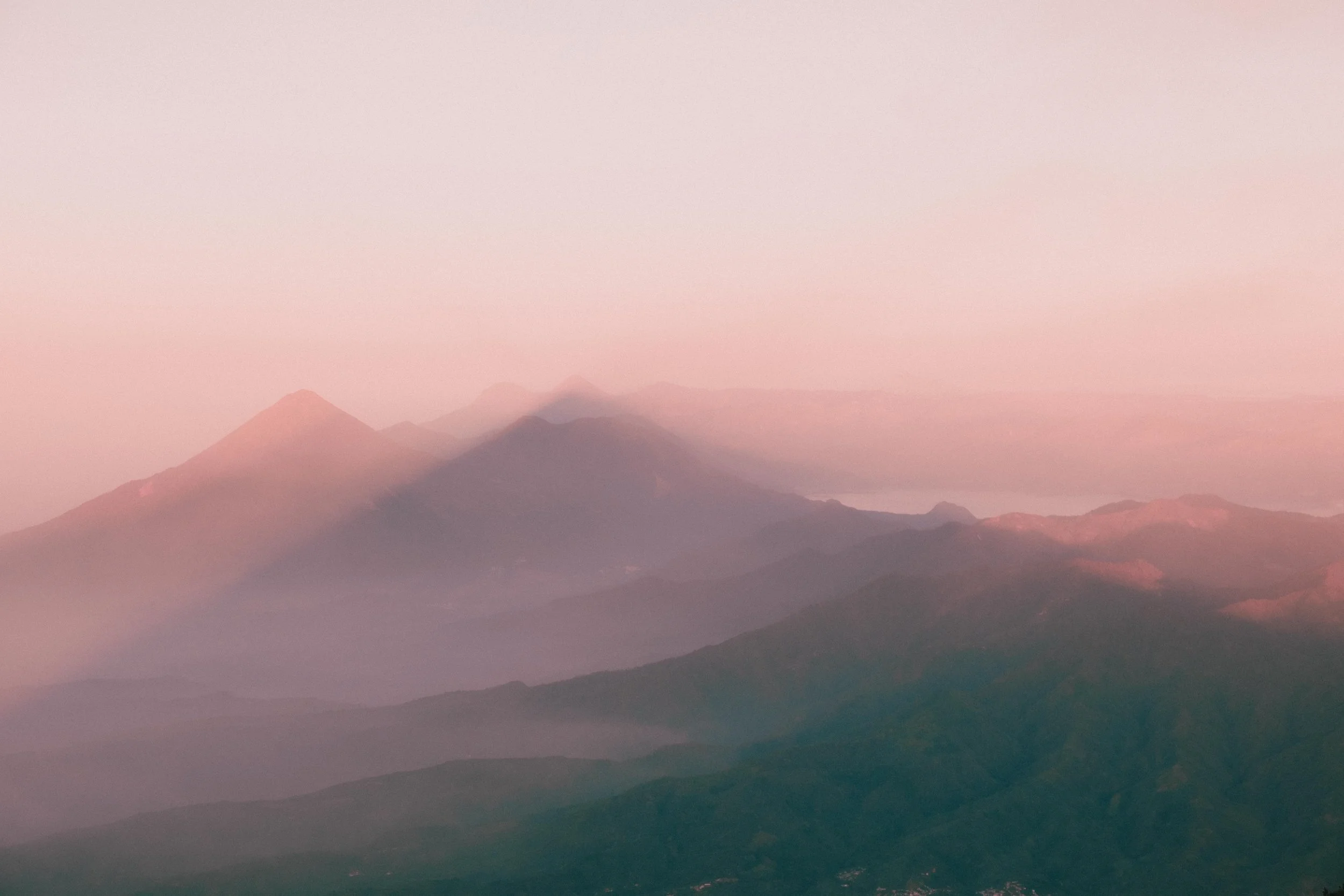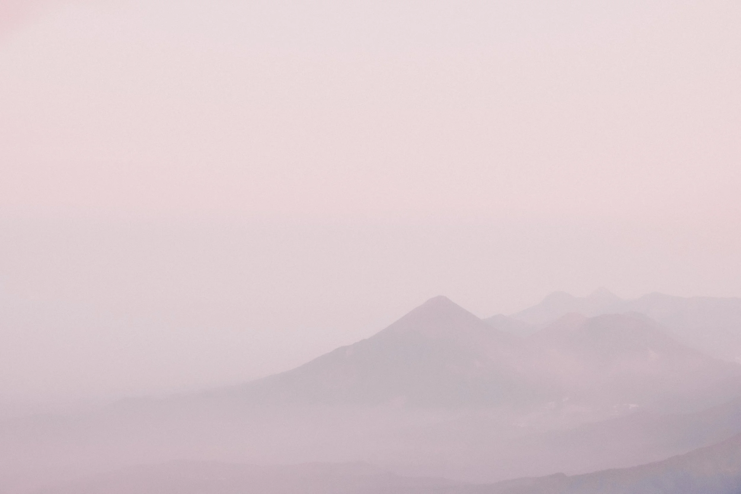 A hazy mountain range at sunset with pastel pink and blue sky.
