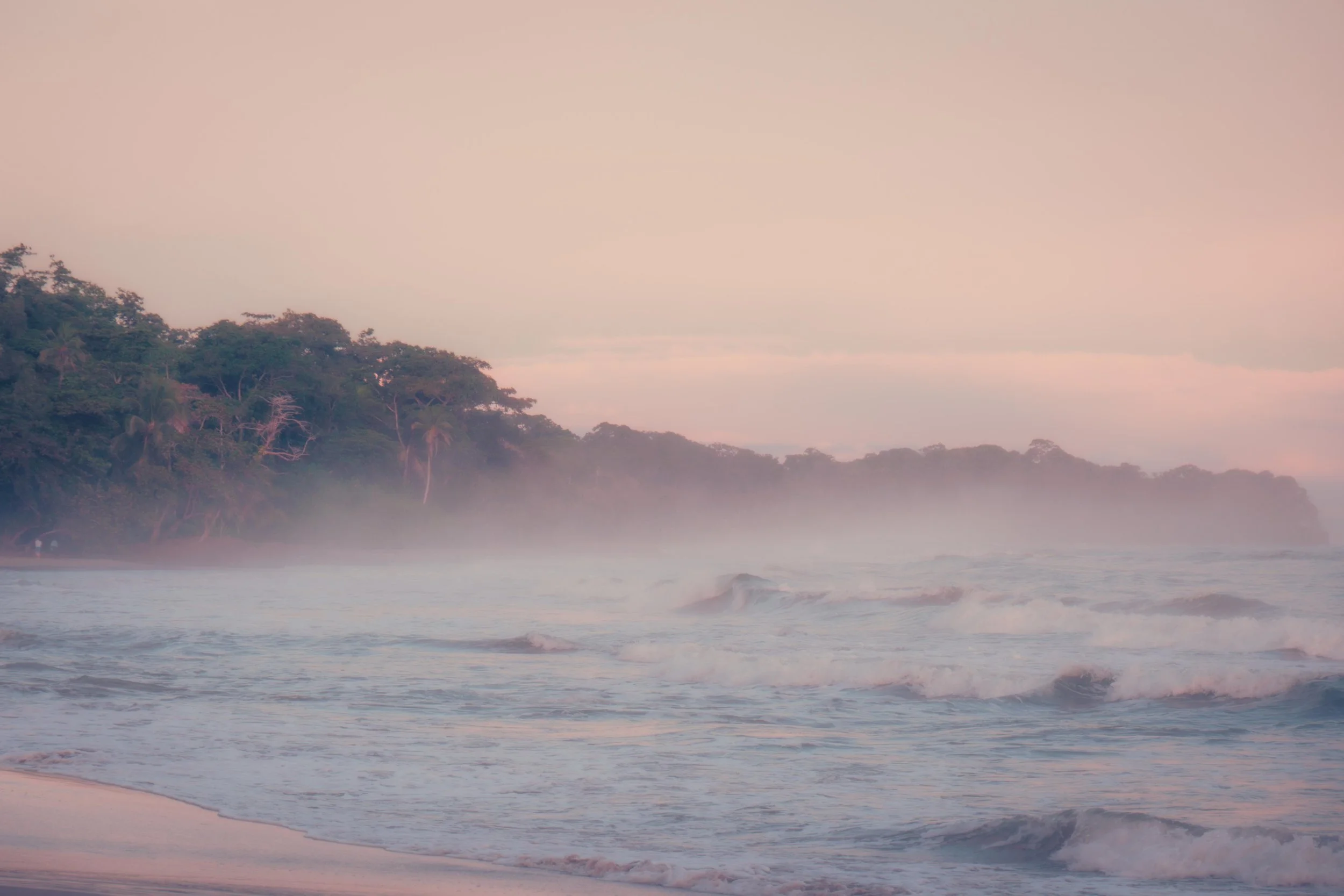 Sunset view of a beach with waves, mist, and a forested coastline in the distance.