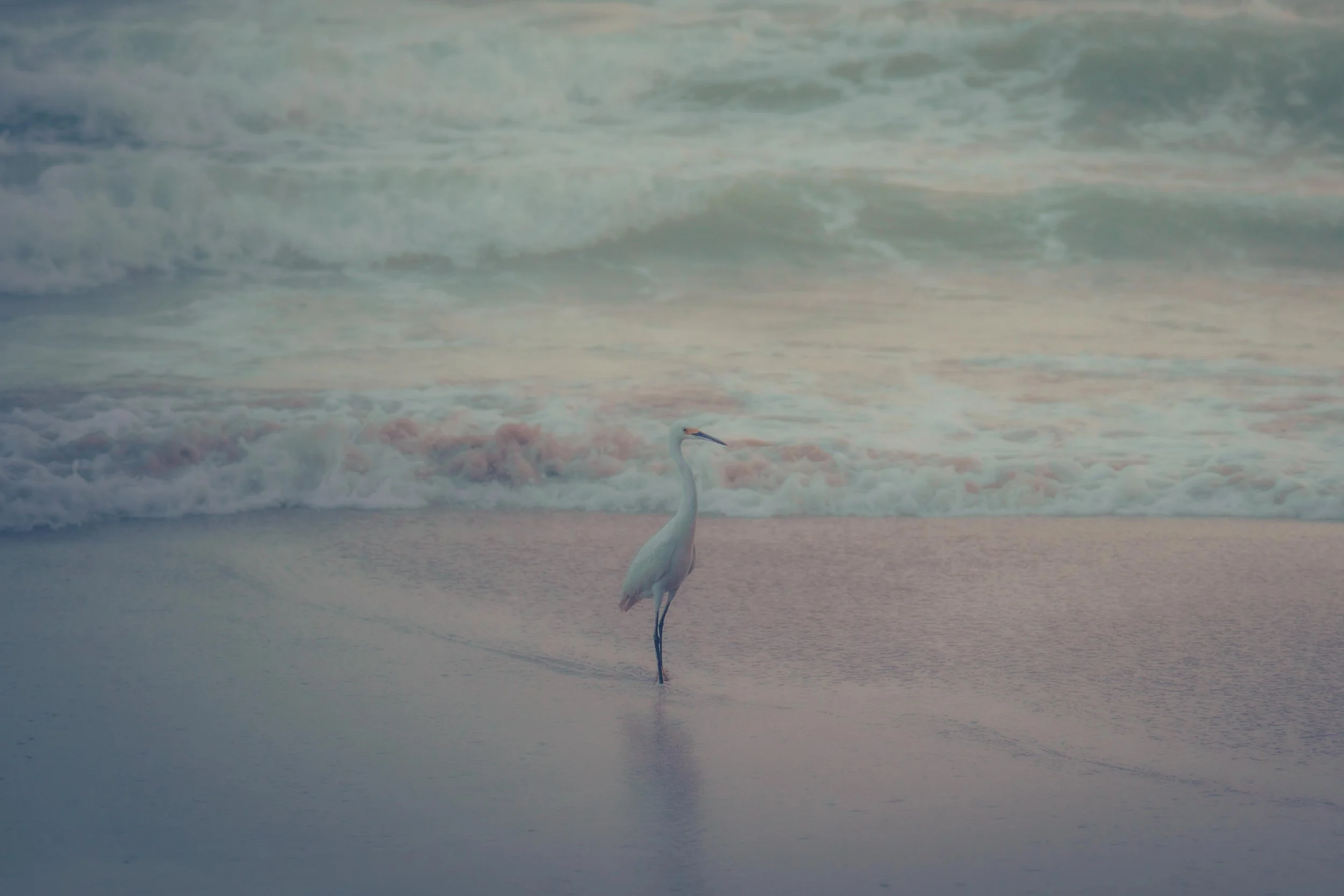 A white heron standing in shallow ocean water near the shore, with waves breaking in the background and pinkish hues reflecting on the water and sky.