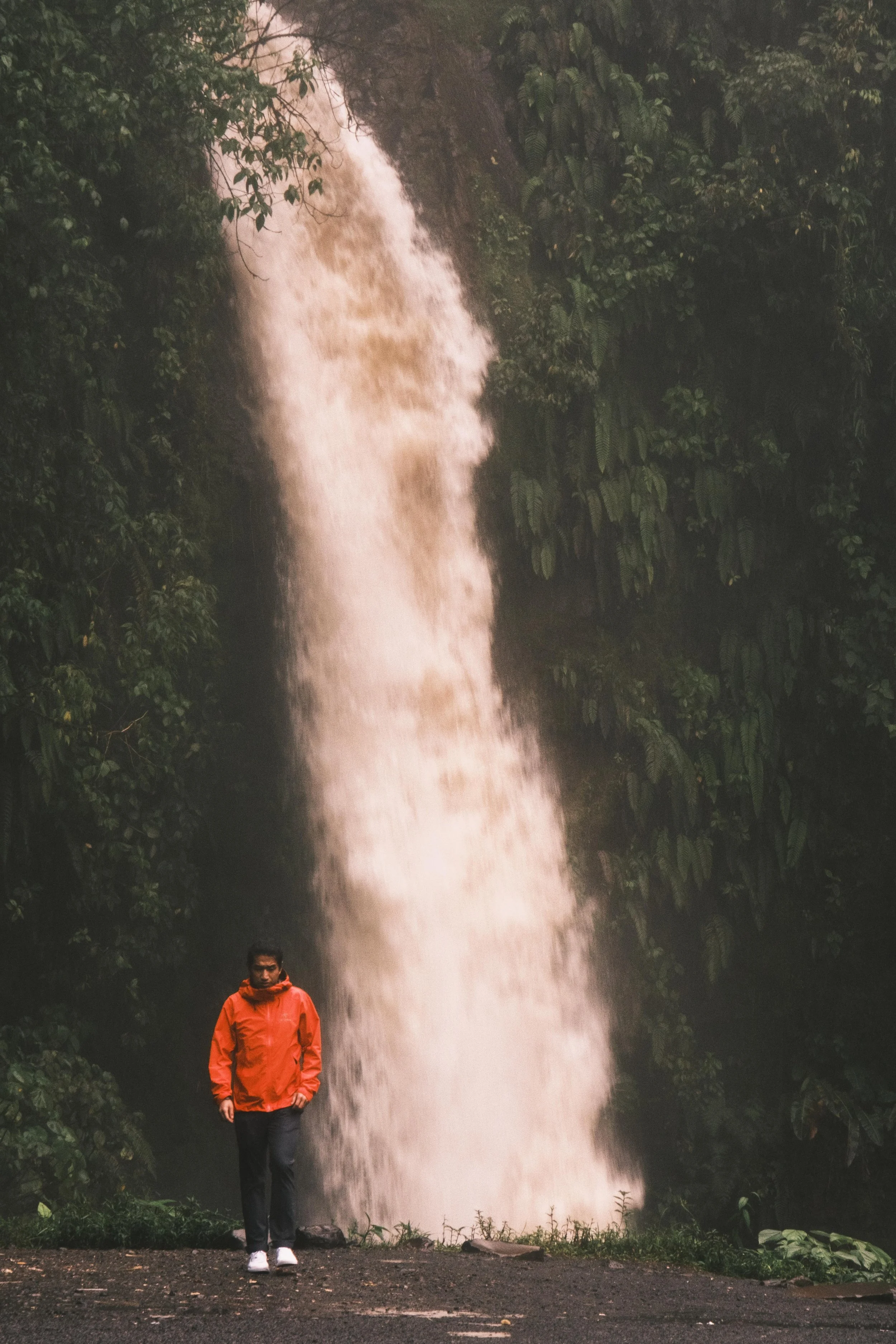 A person in a red jacket stands in front of a large waterfall surrounded by dense greenery.