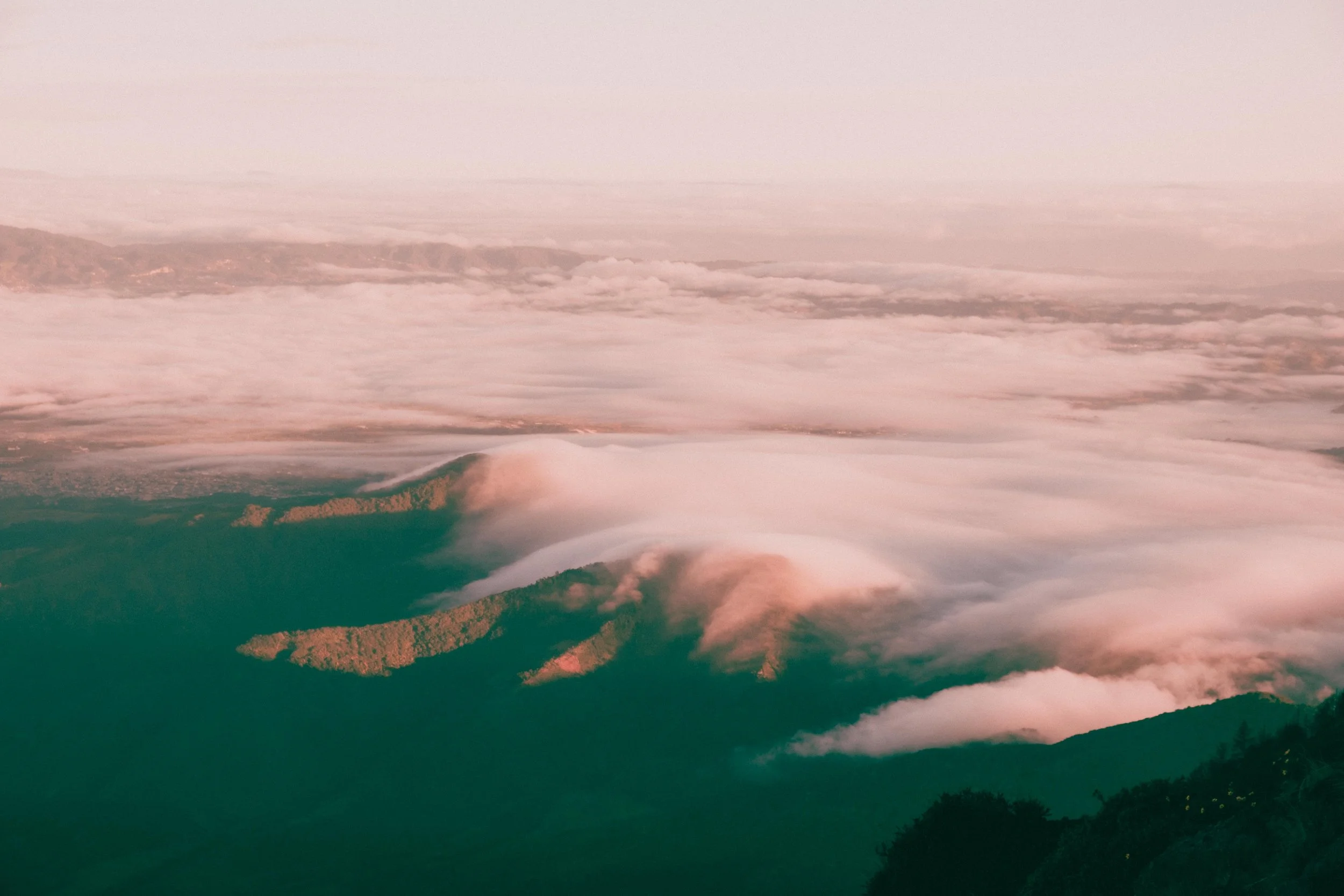 A hazy mountain landscape with multiple peaks visible through mist or fog.