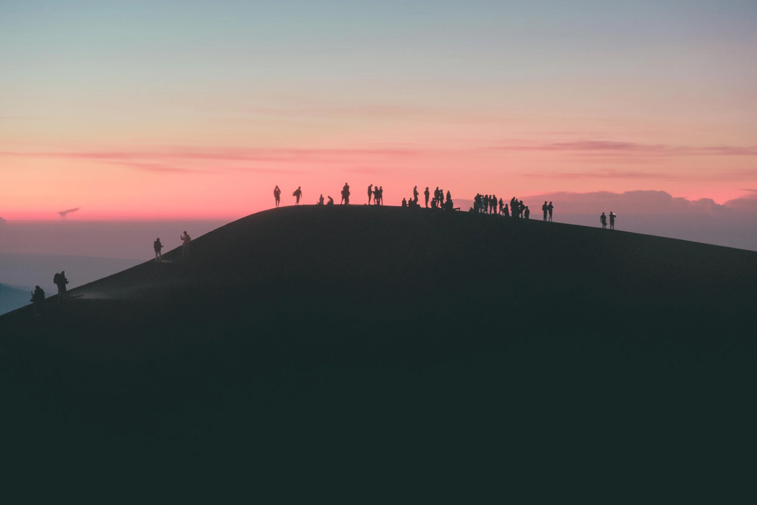 Silhouettes of people standing and sitting on a hill against a colorful sunset sky.