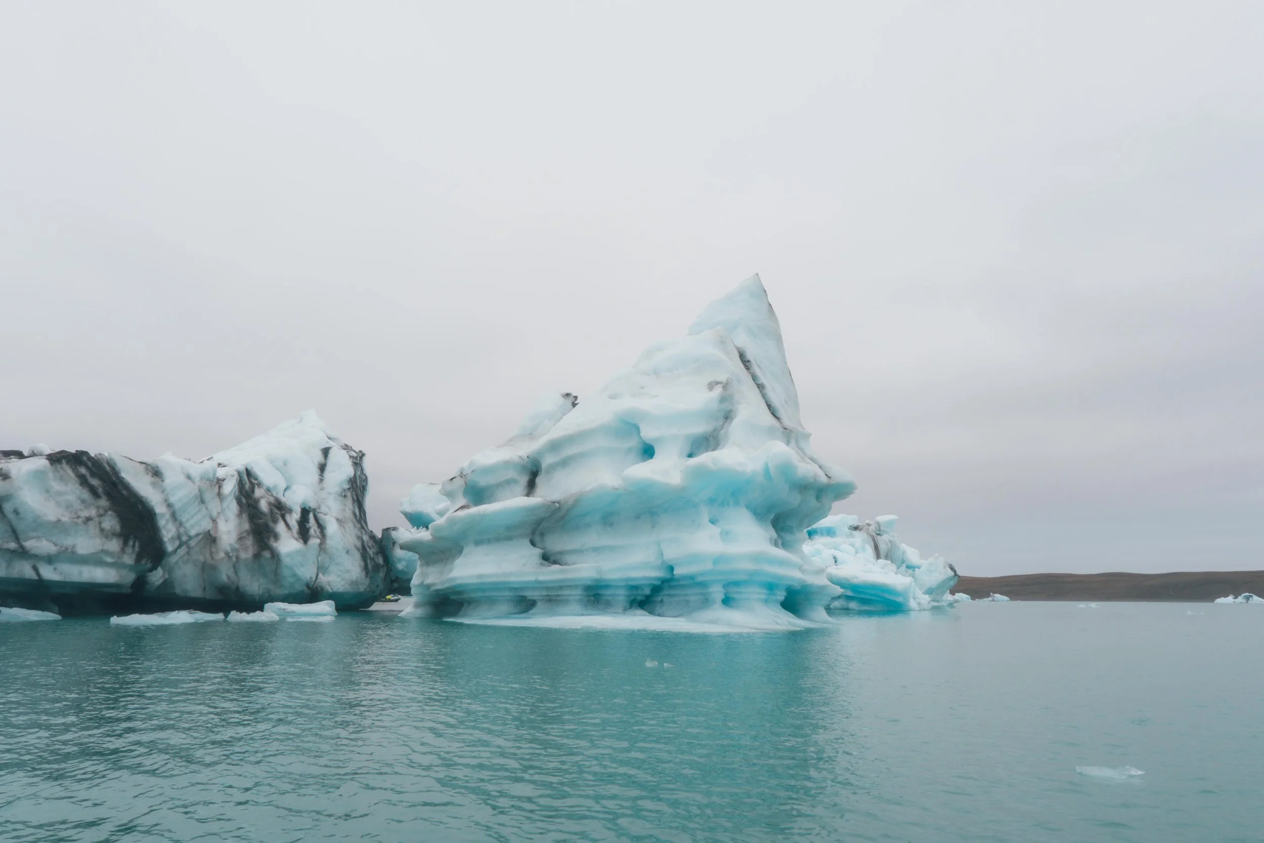 Large floating iceberg in cold ocean waters under overcast sky, with small icebergs in background.