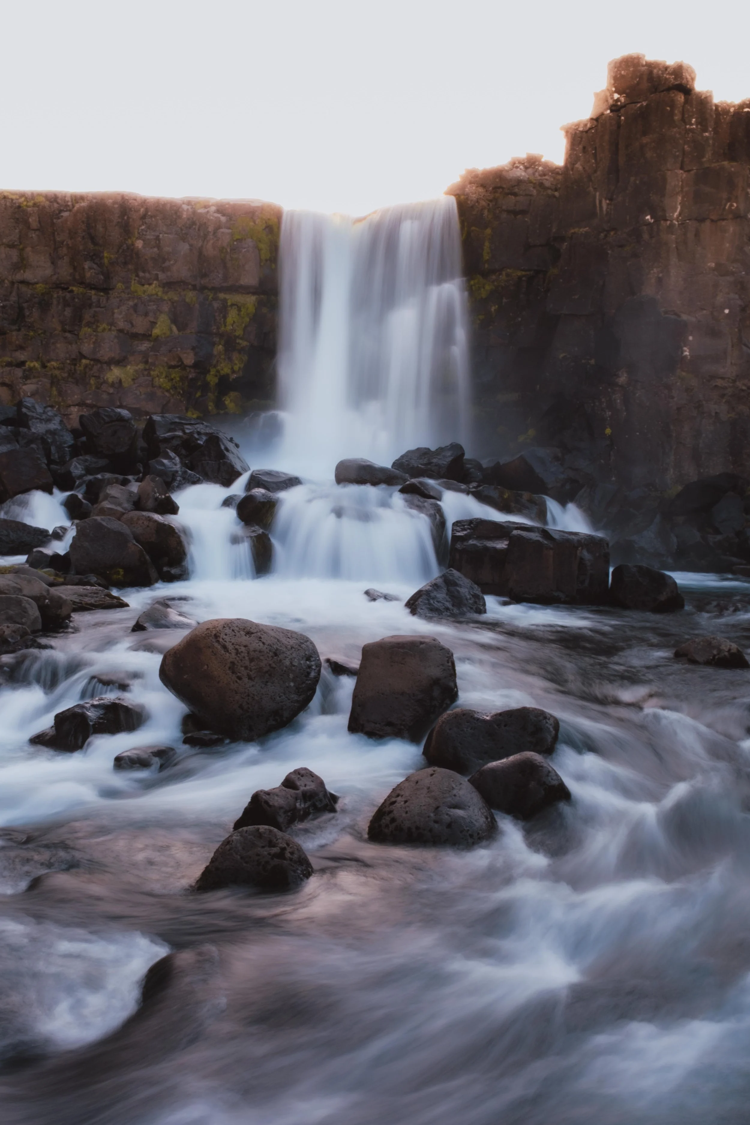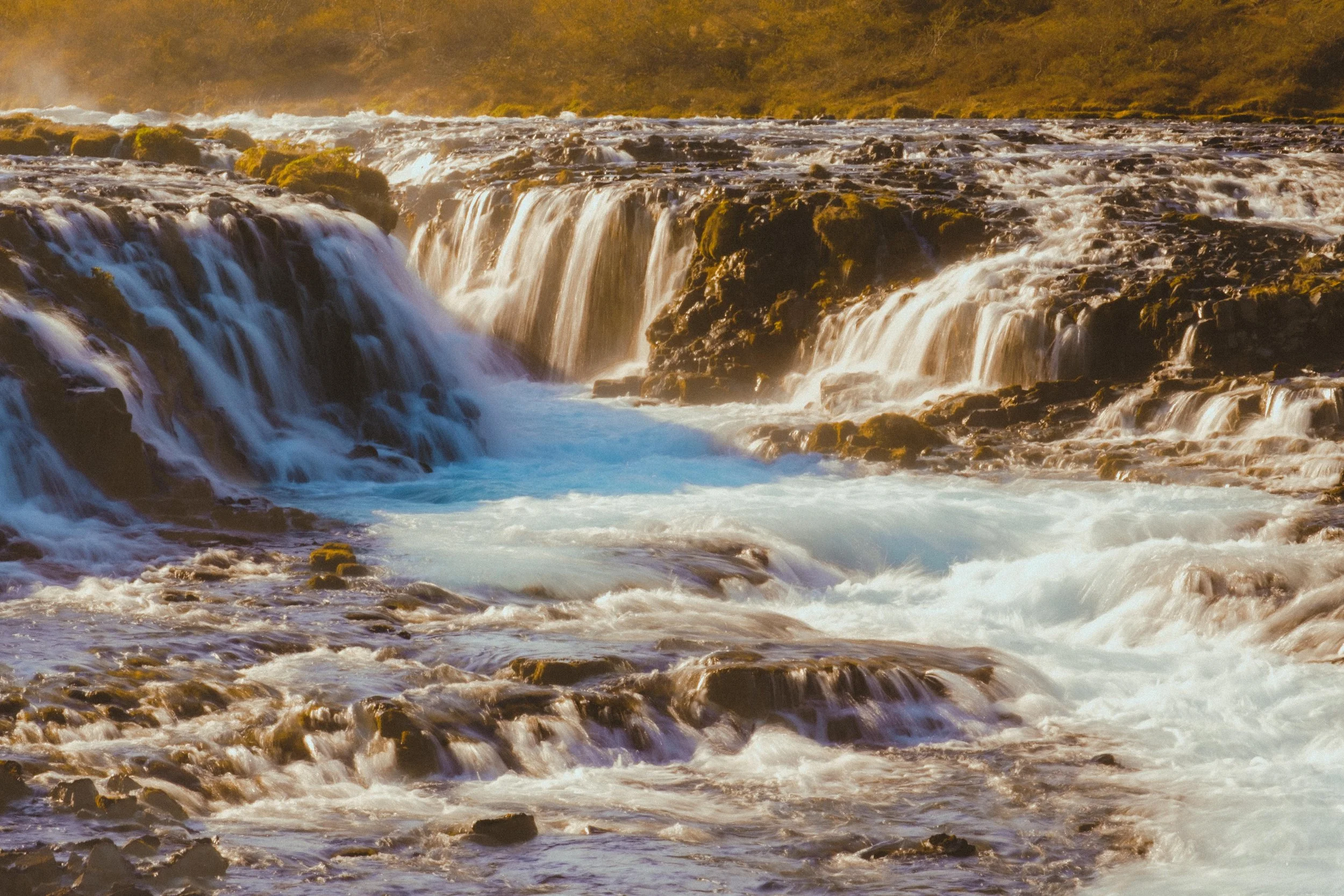 A scenic view of a waterfall cascading over rocks in a natural landscape, with water flowing rapidly into a pool below.