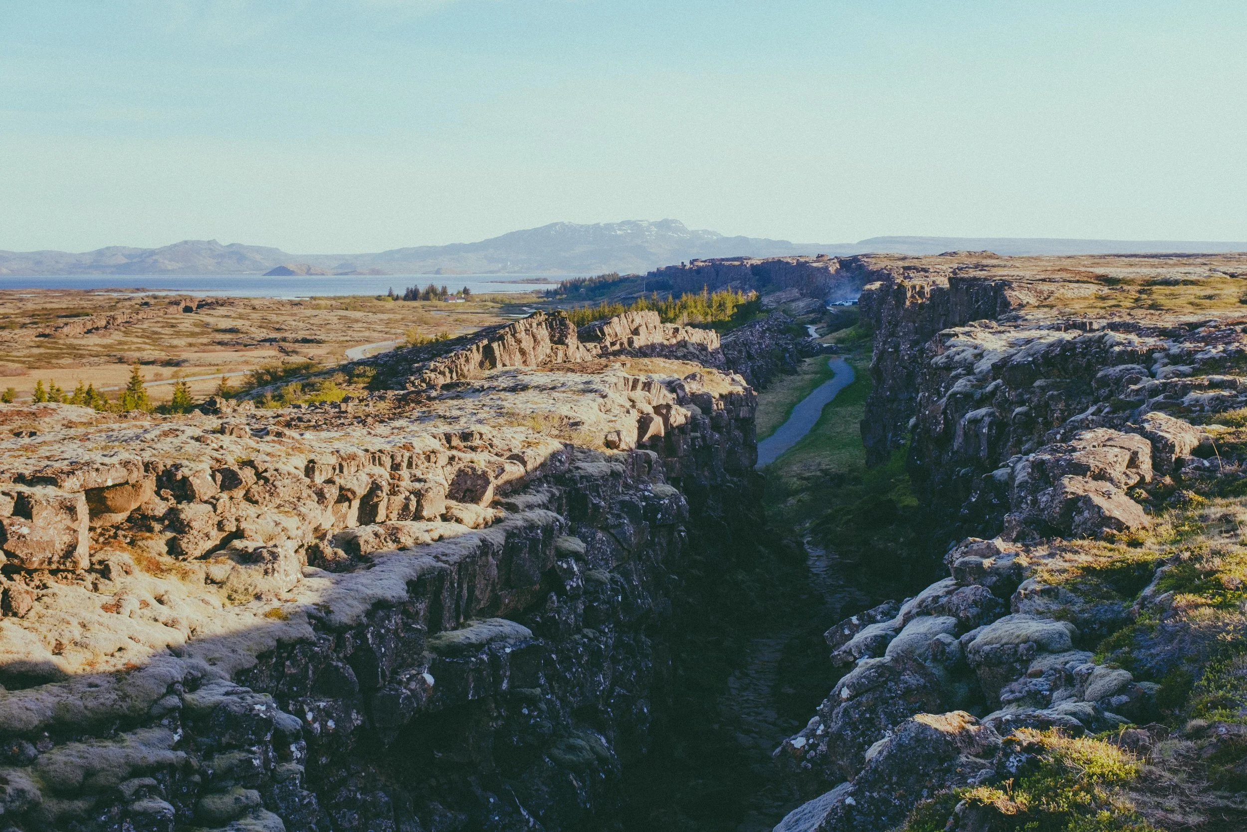 A deep canyon with rocky walls and a narrow stream flowing through its base, with a road running alongside it, under a clear blue sky, possibly in a volcanic or mountainous landscape.