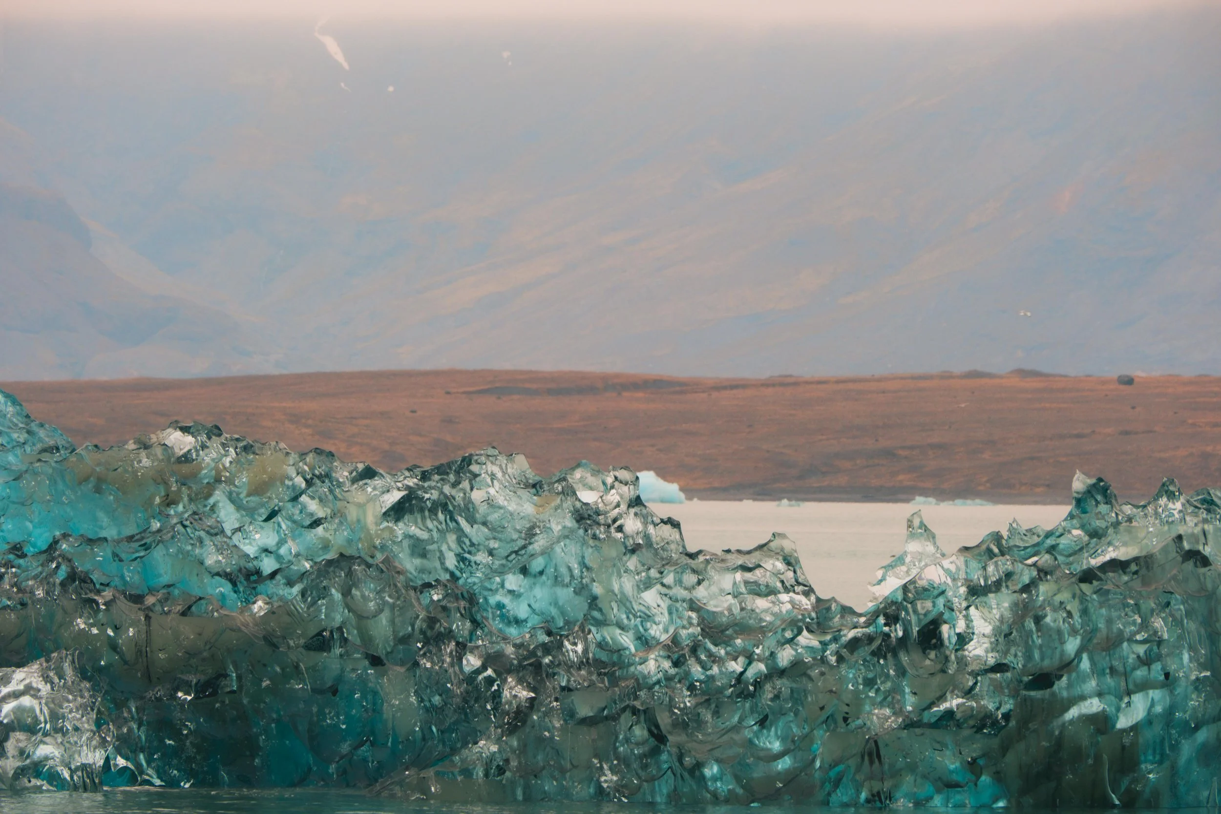 Close-up of a glacier with blue and white ice chunks in front of a barren landscape and mountains in the background.