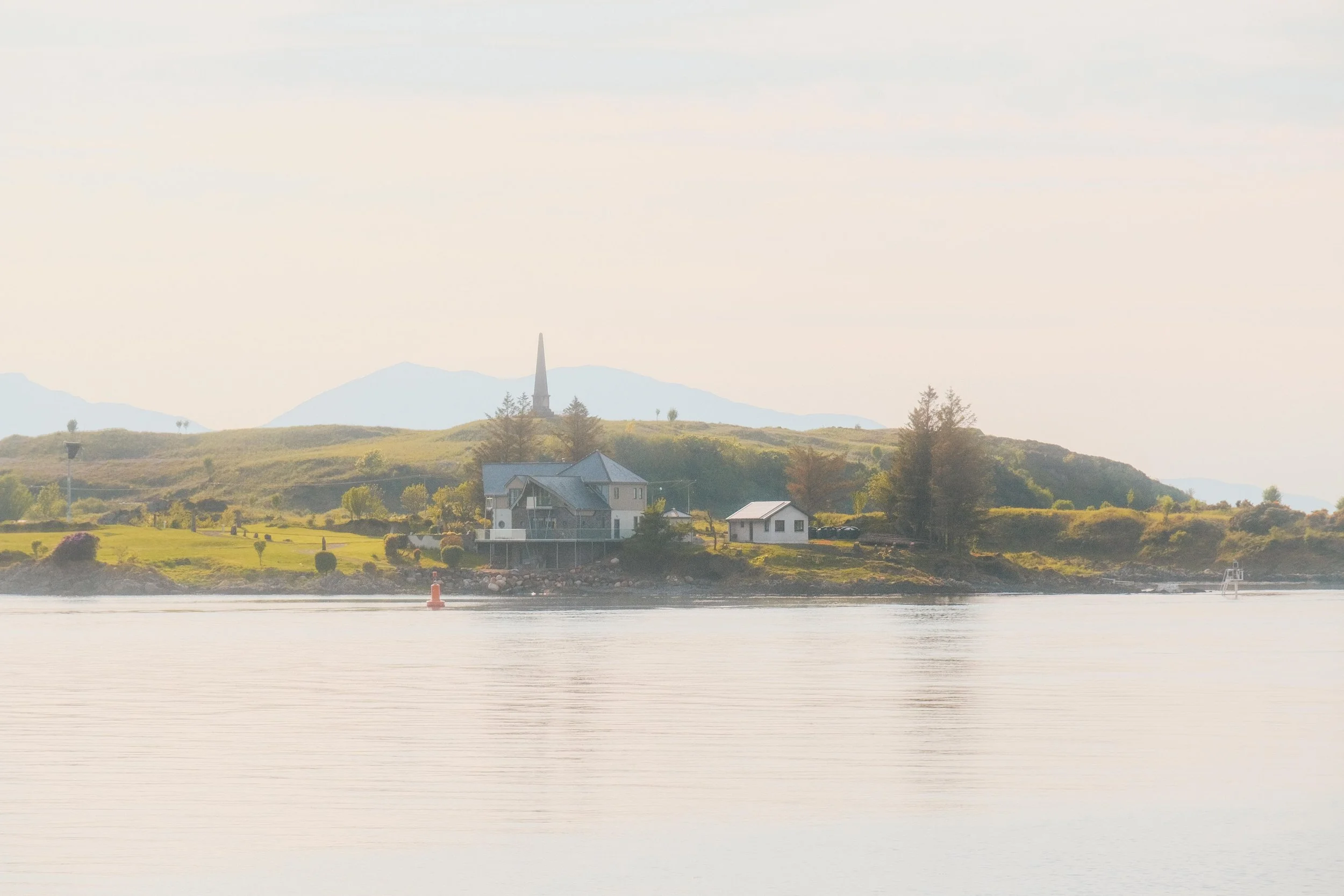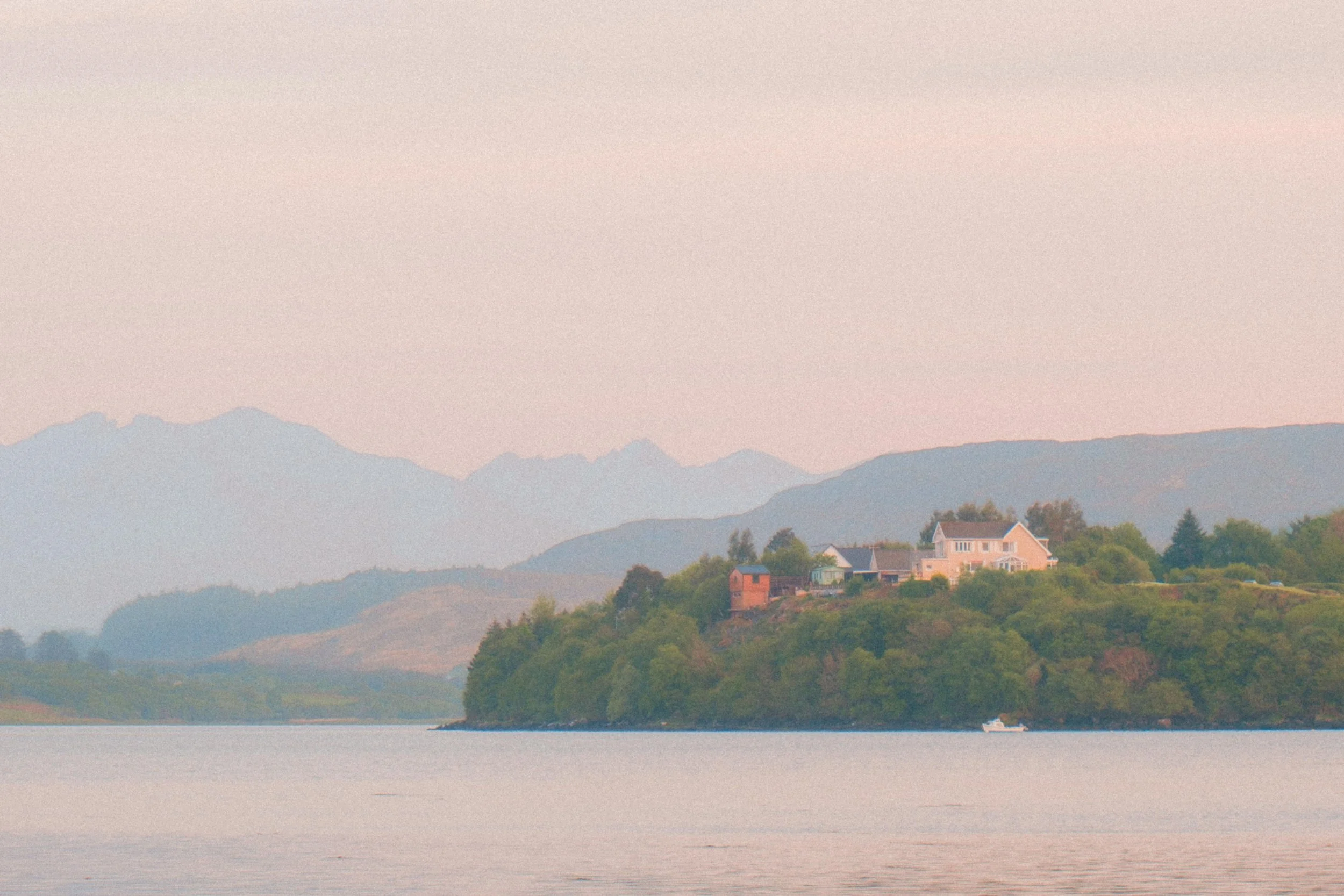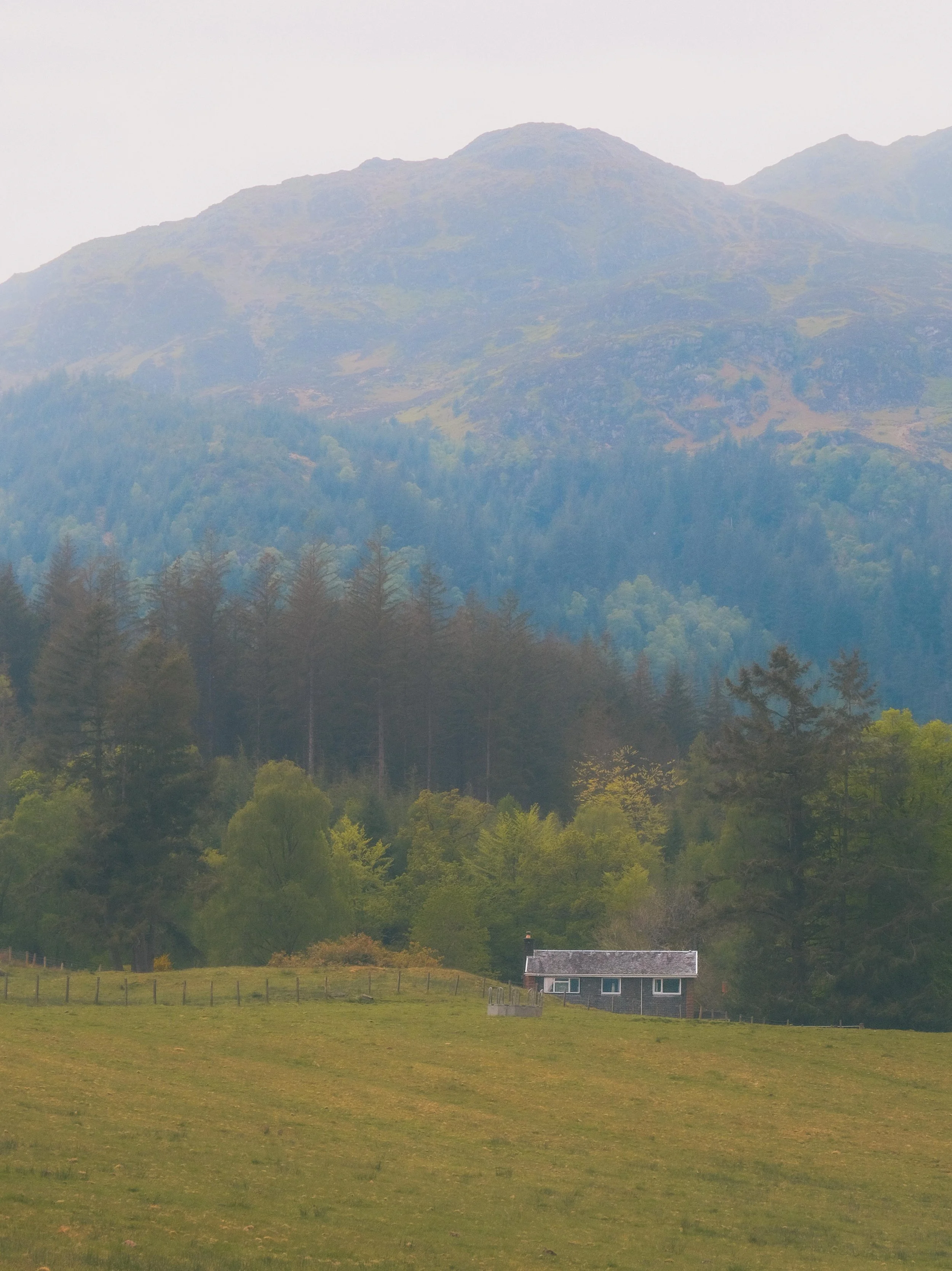 A small house with a gray roof and chimney situated in a green field, surrounded by trees with a mountain range in the background.