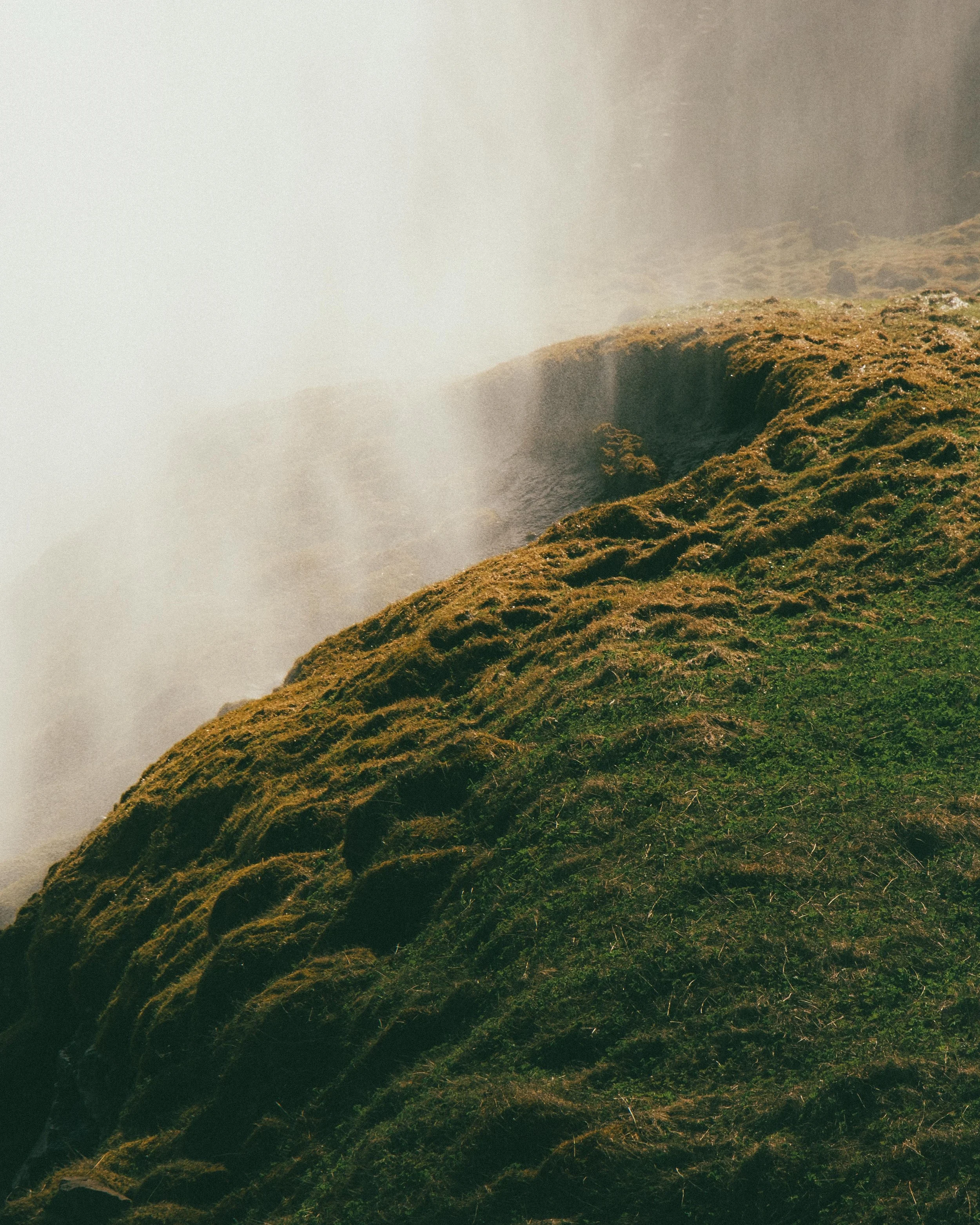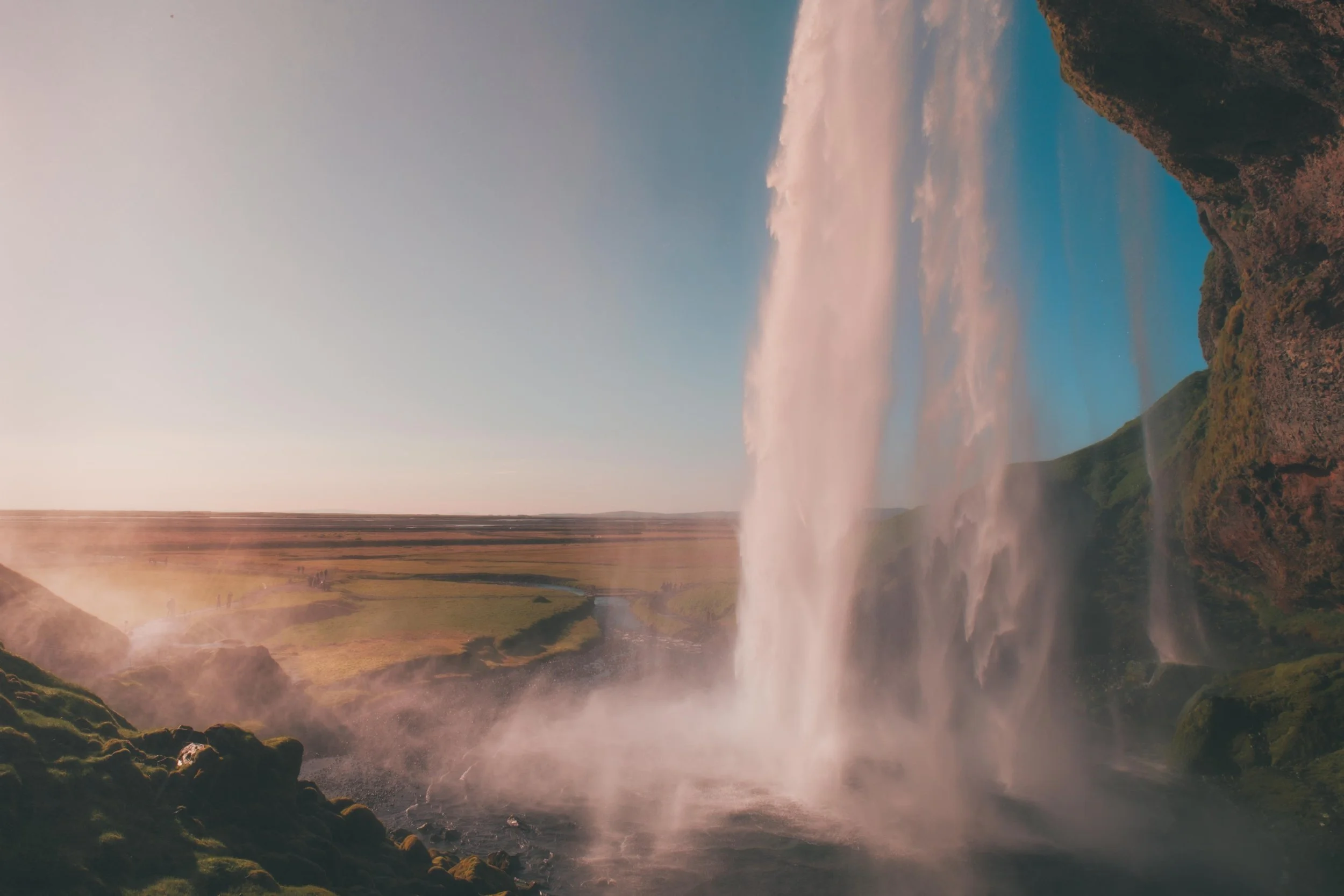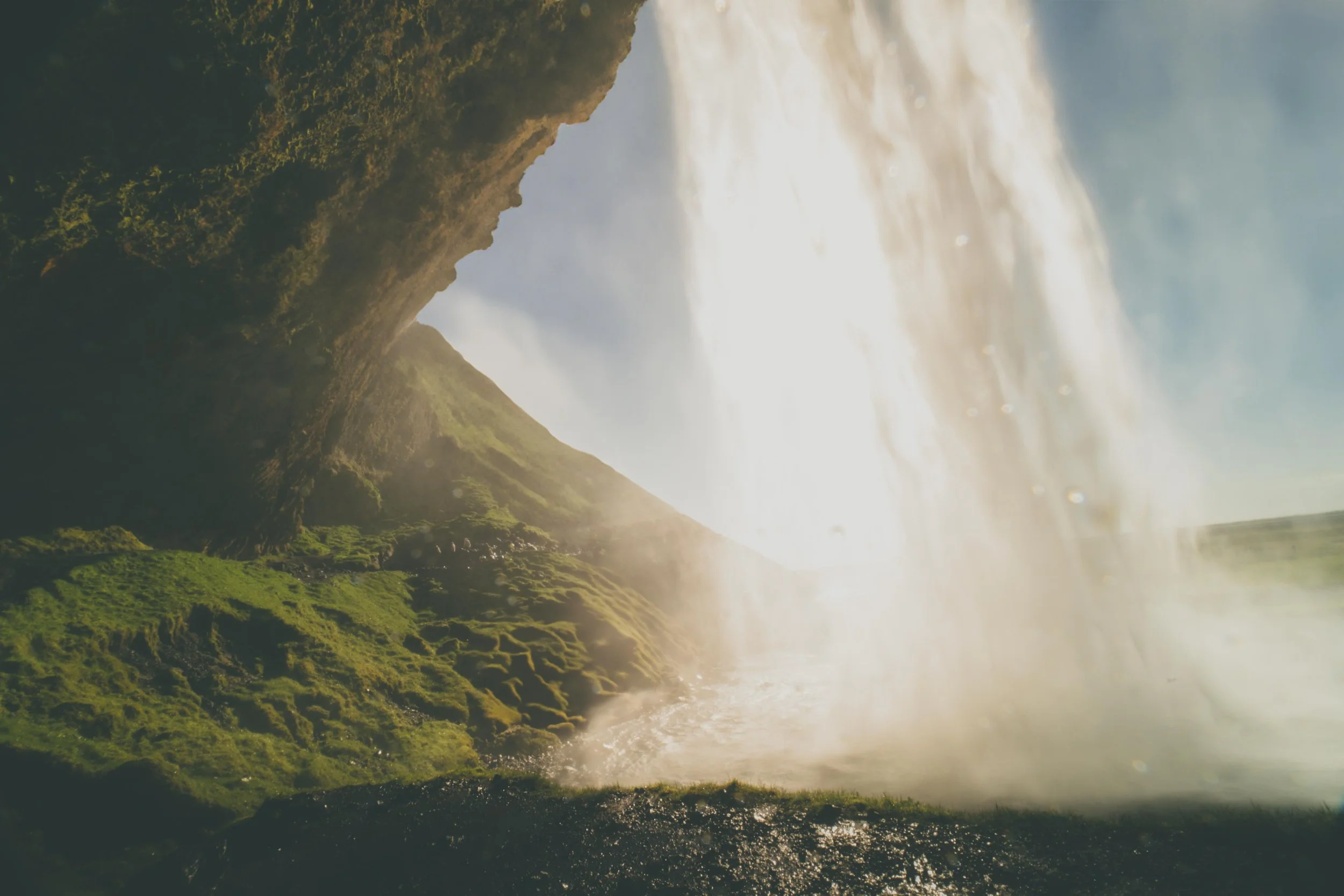 View from behind a waterfall showing lush green landscape and steep cliffs in the background with sunlight shining through the mist.