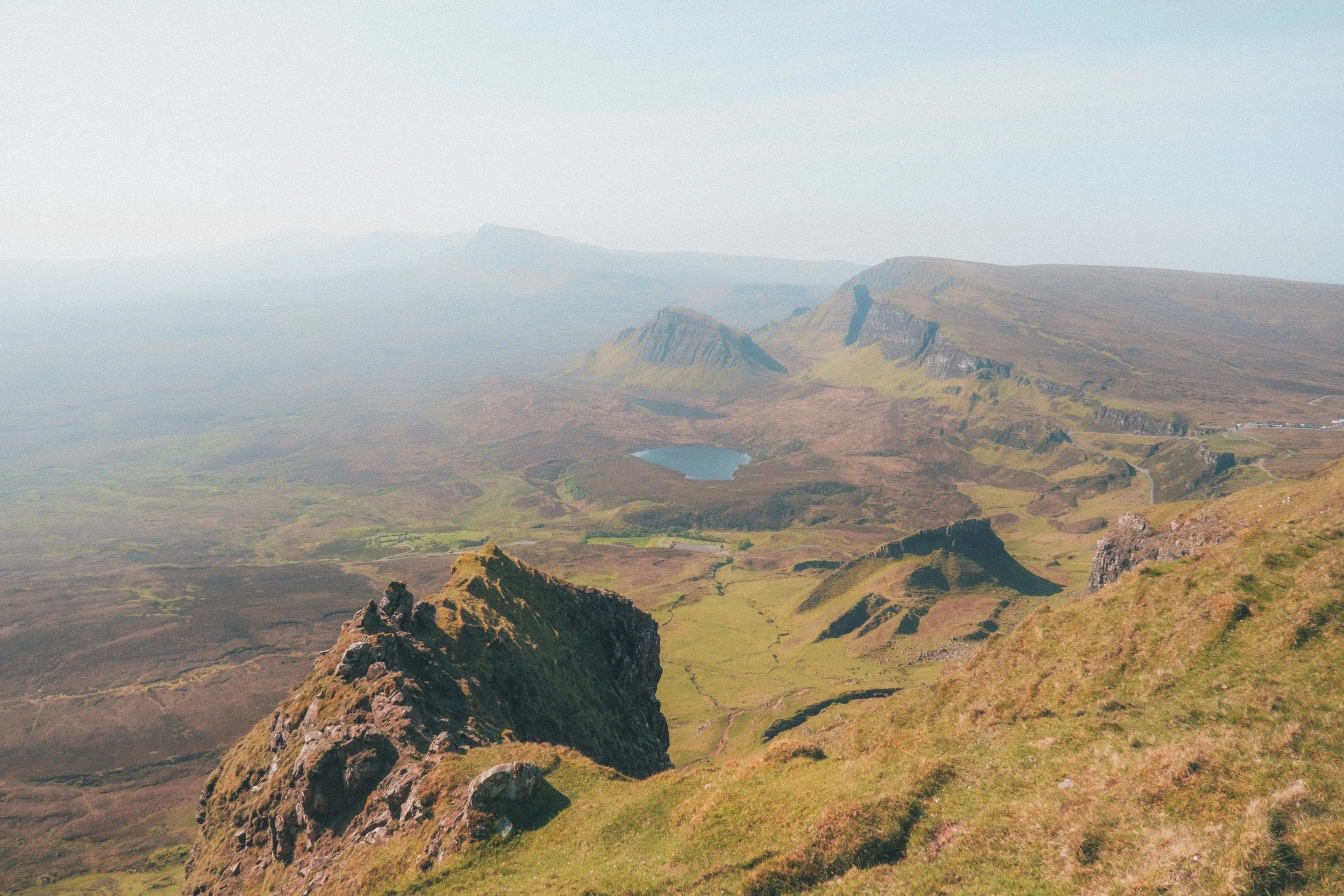 Scenic view of rolling green hills and rocky cliffs with a small lake in the valley and distant mountains under a clear sky.