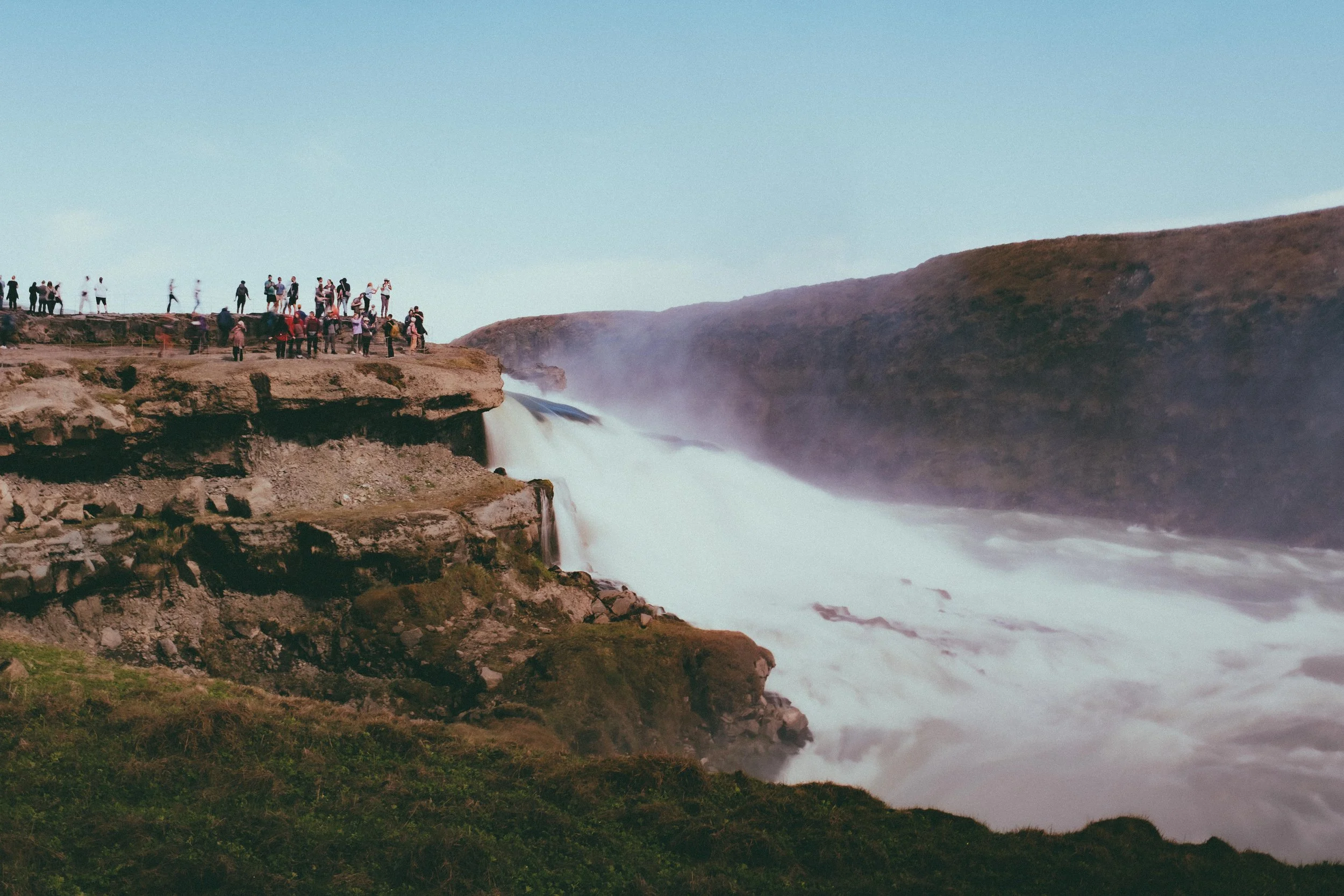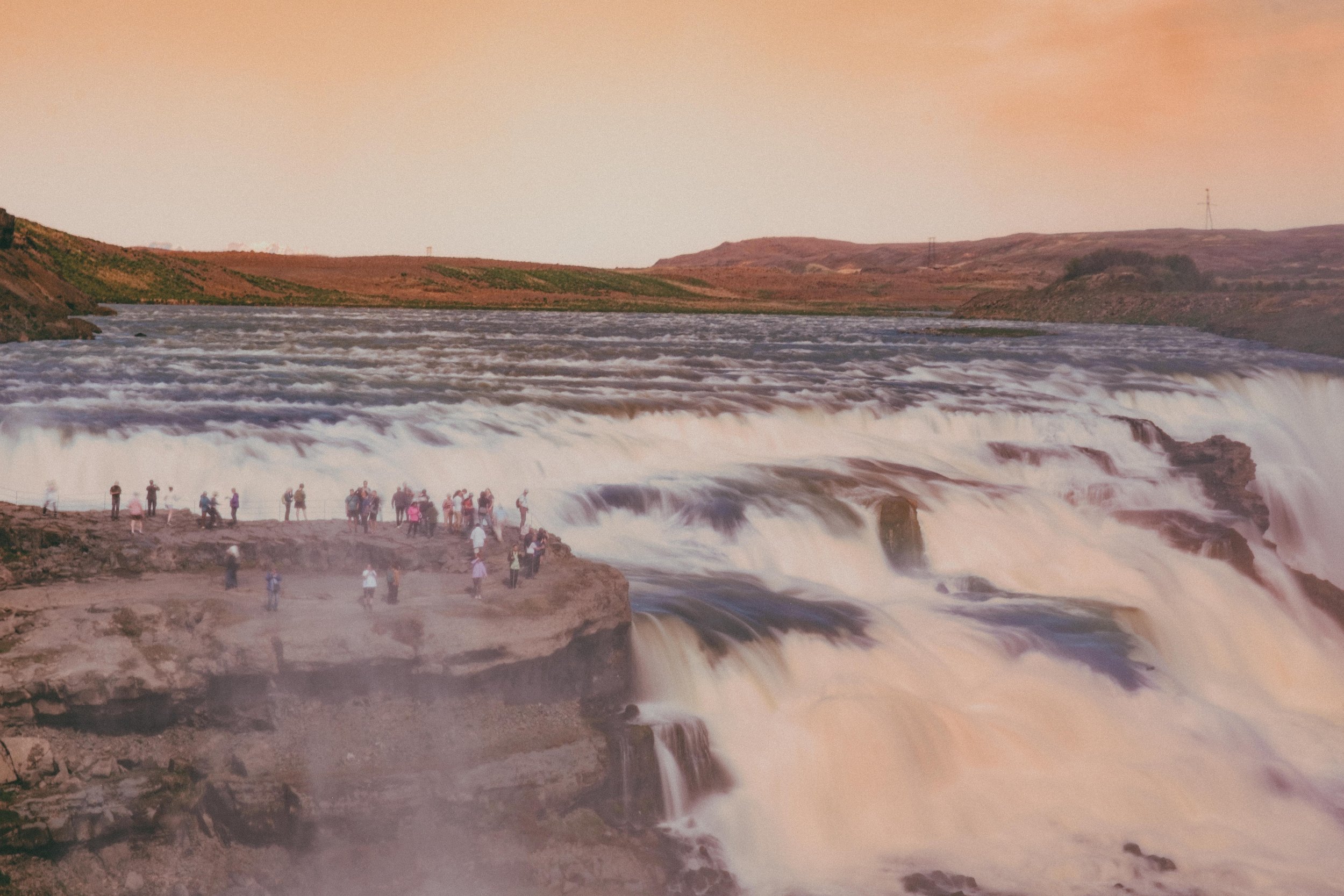 A large group of tourists on a cliff overlooking a waterfall with white water flowing over rocks and lush green hills in the background.