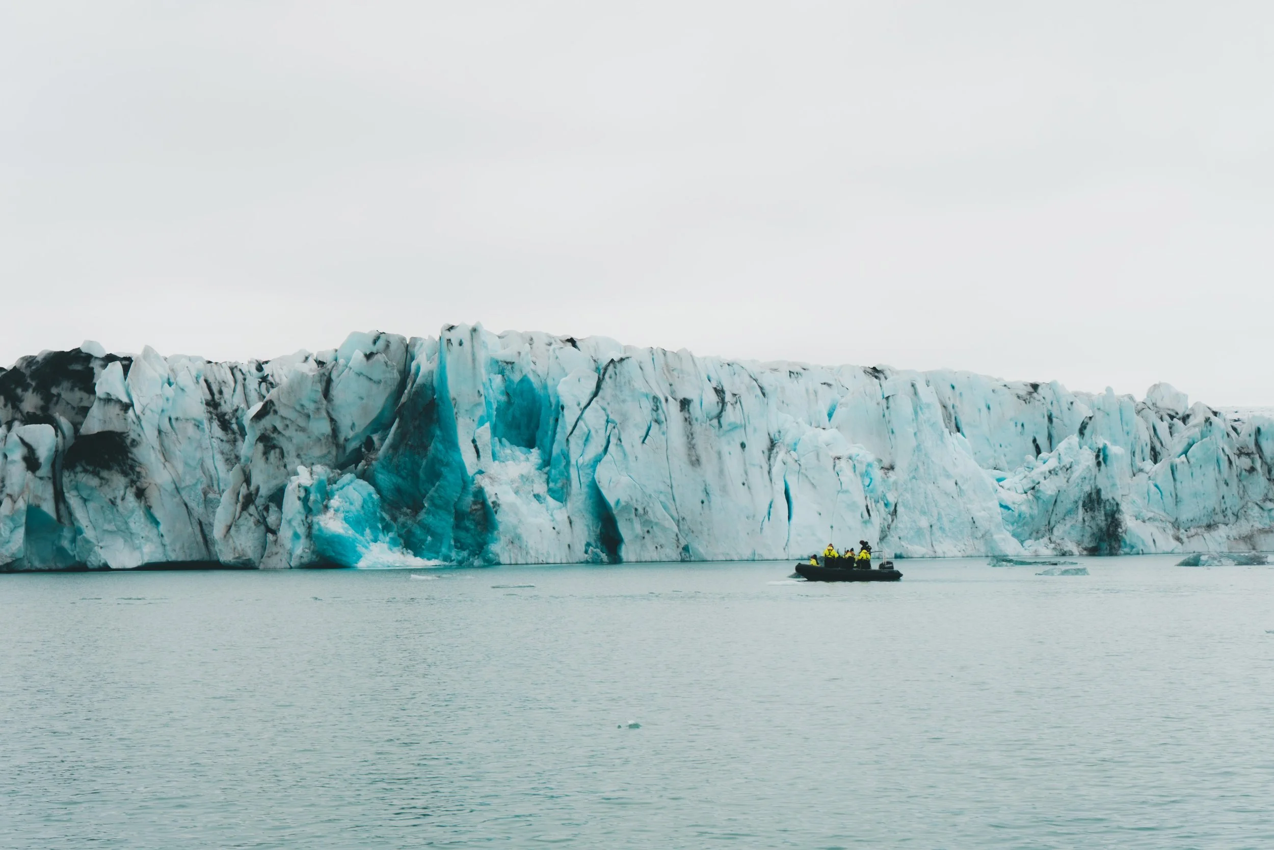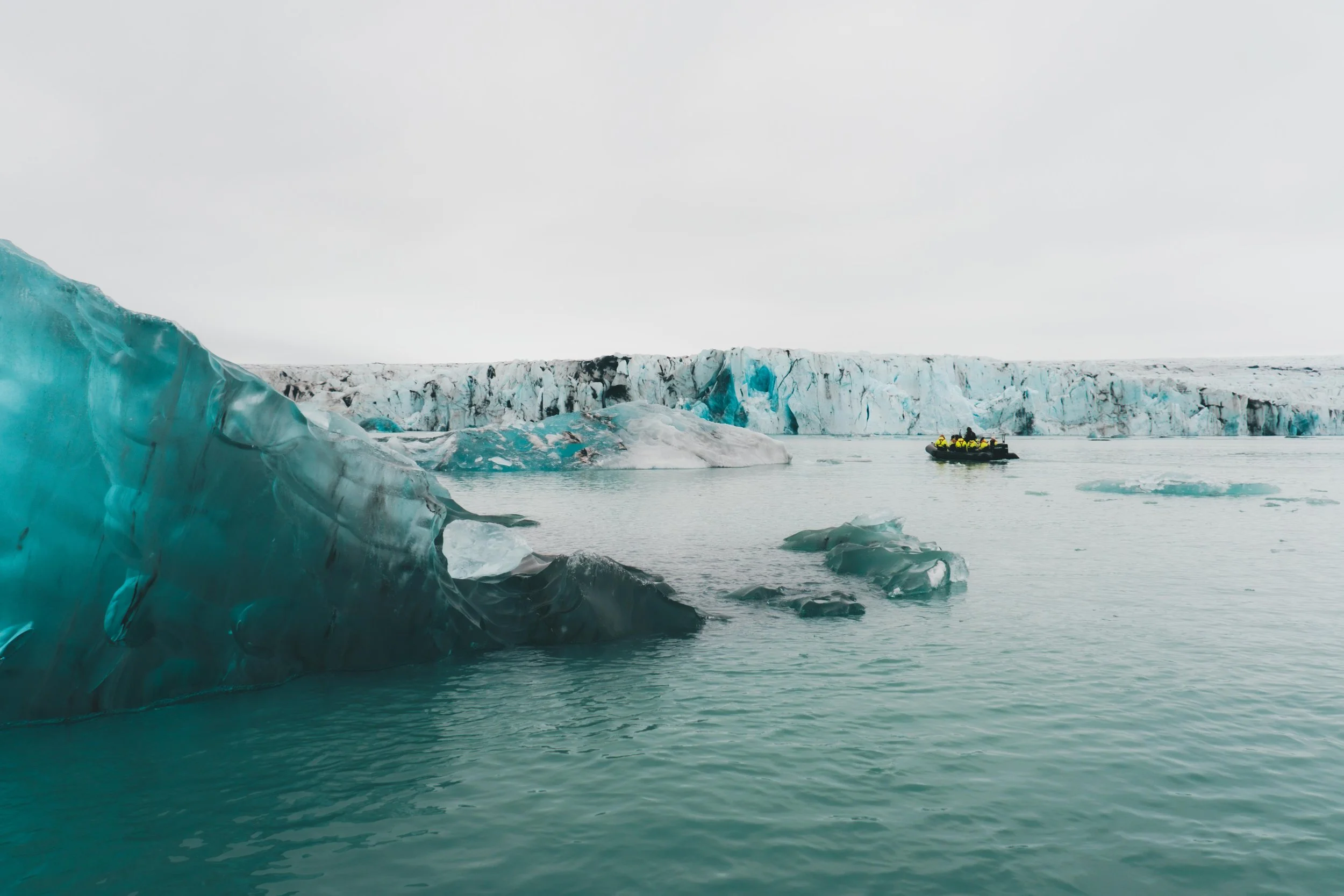 A small boat with passengers floats near icebergs and glaciers in a cold, icy landscape.