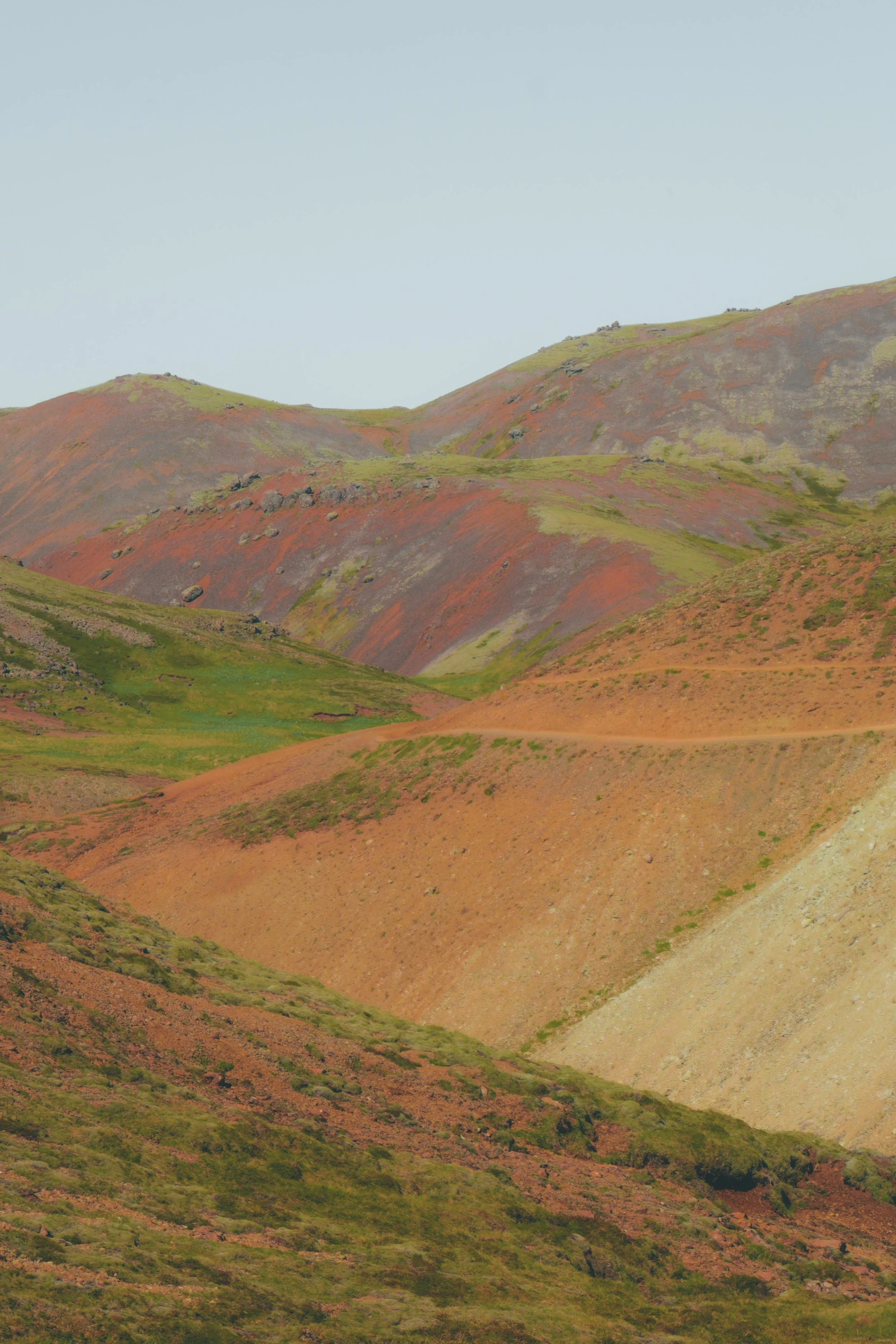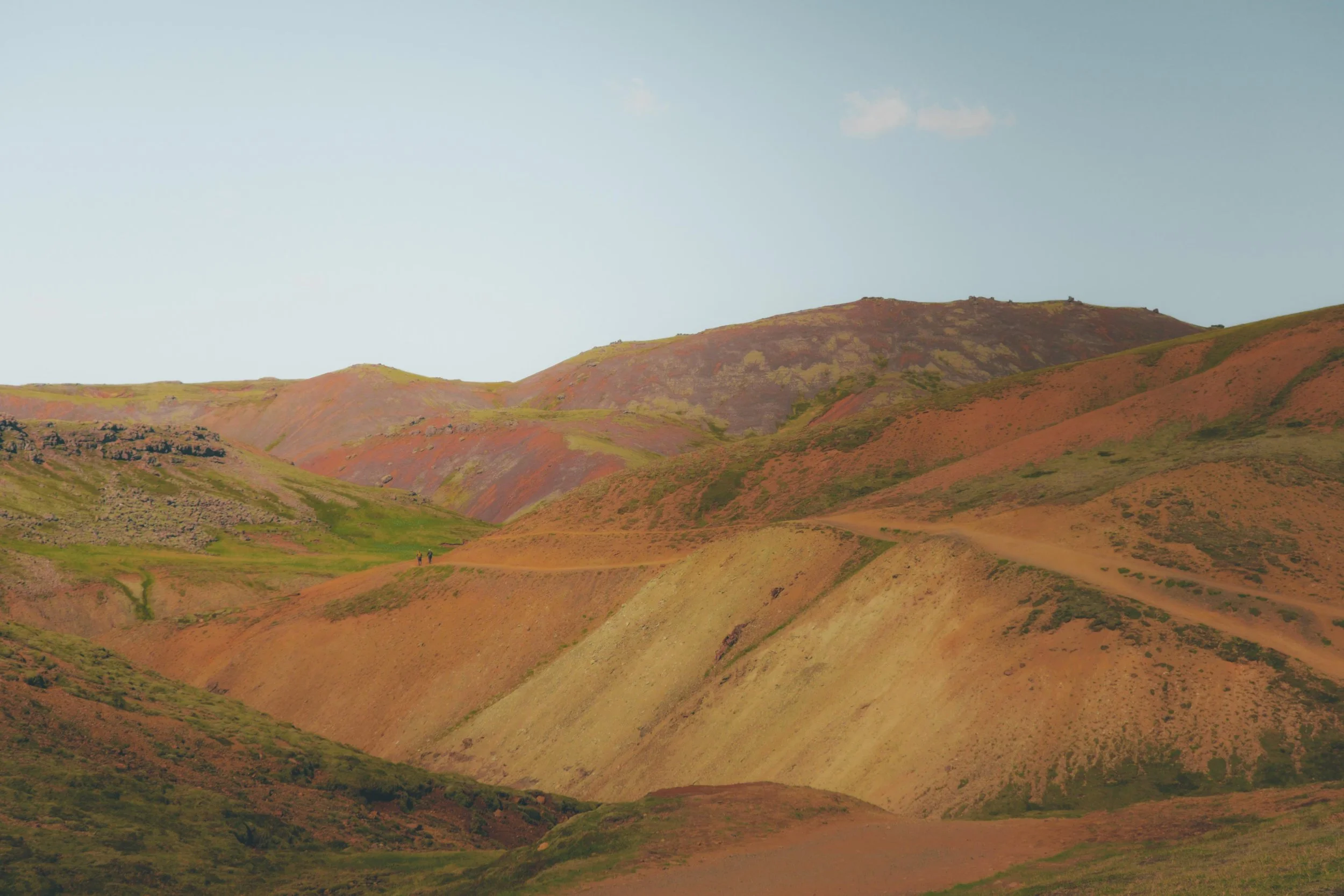 Rolling hills with colorful patches of green, brown, and reddish hues under a clear sky.