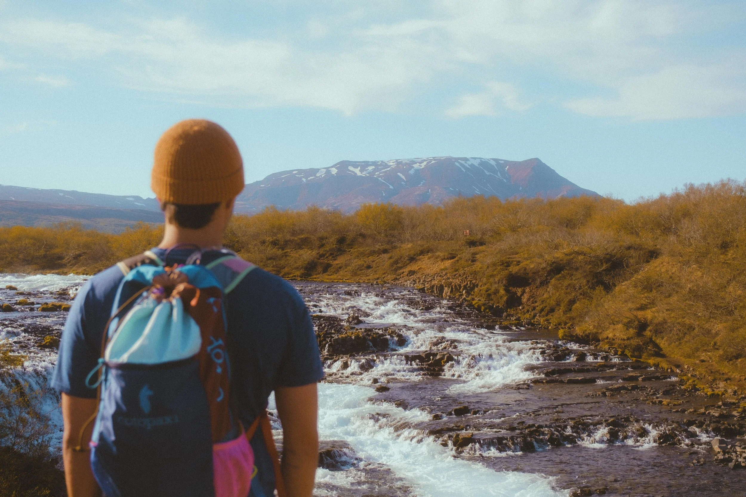 A person with a backpack and a brown hat looking at a river with a mountain in the distance.