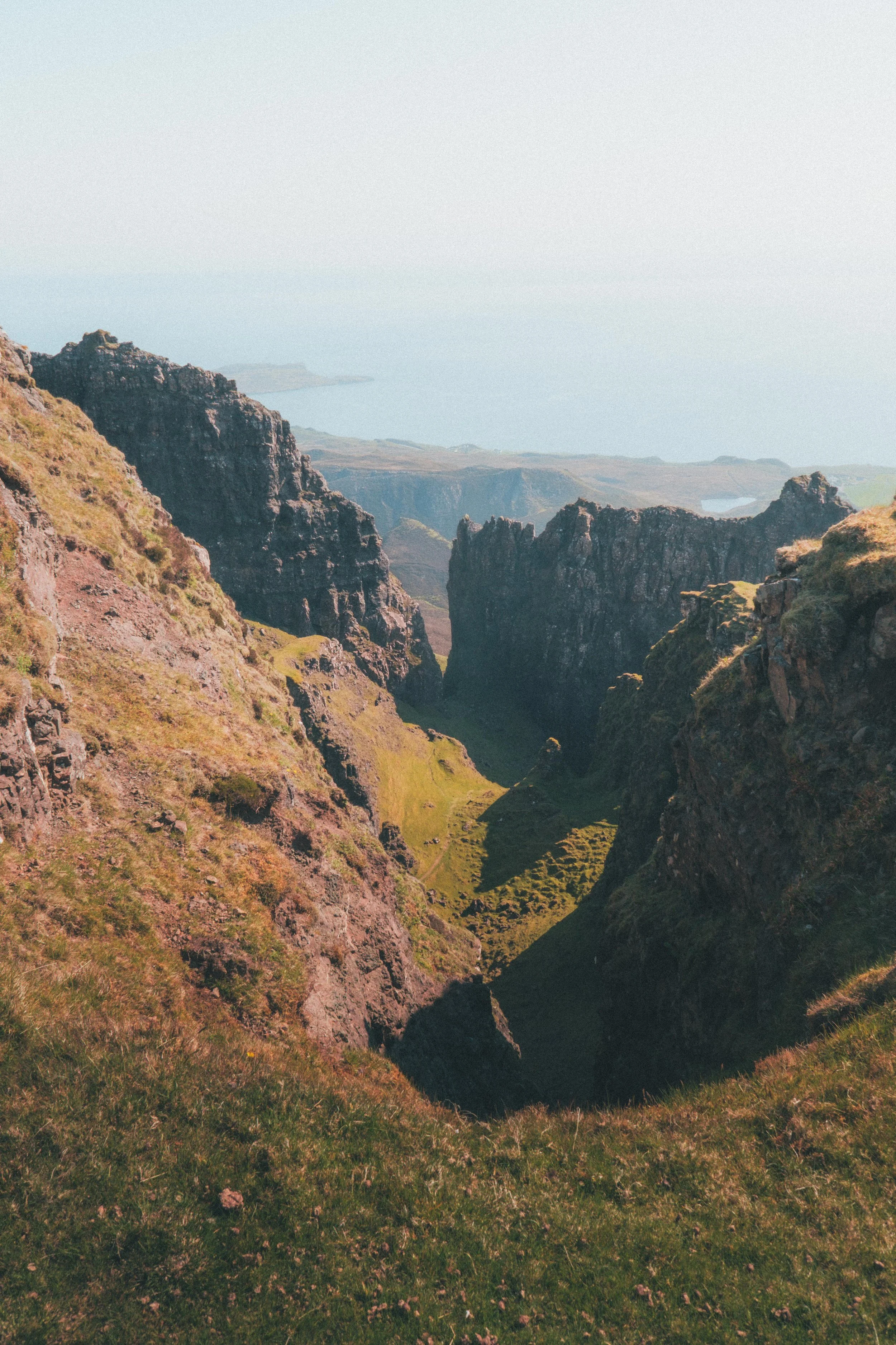 A scenic view of green grassy cliffs with rocky formations and a valley leading to the ocean in the distance.