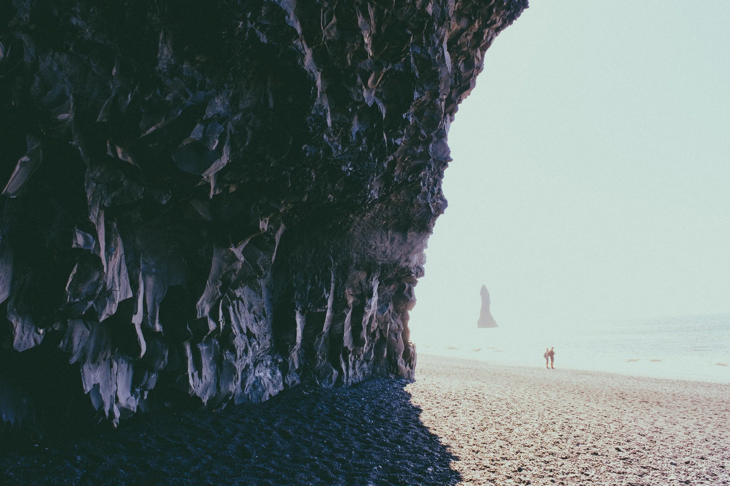 View of a rocky cave opening on a sandy beach with two people walking along the shoreline and large sea stacks in the background.