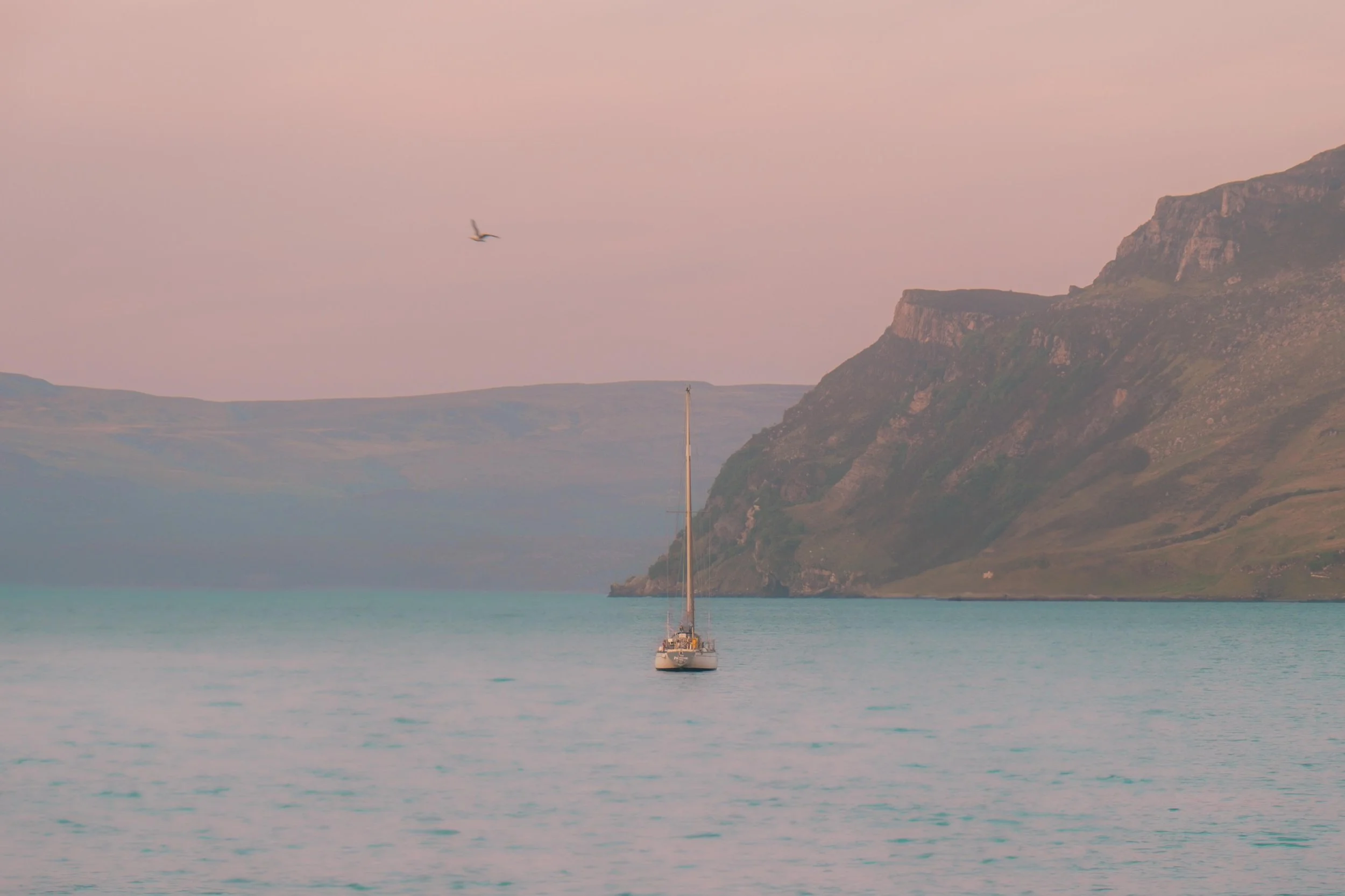A sailboat on calm water near a mountainous shoreline during sunset, with a bird flying overhead.