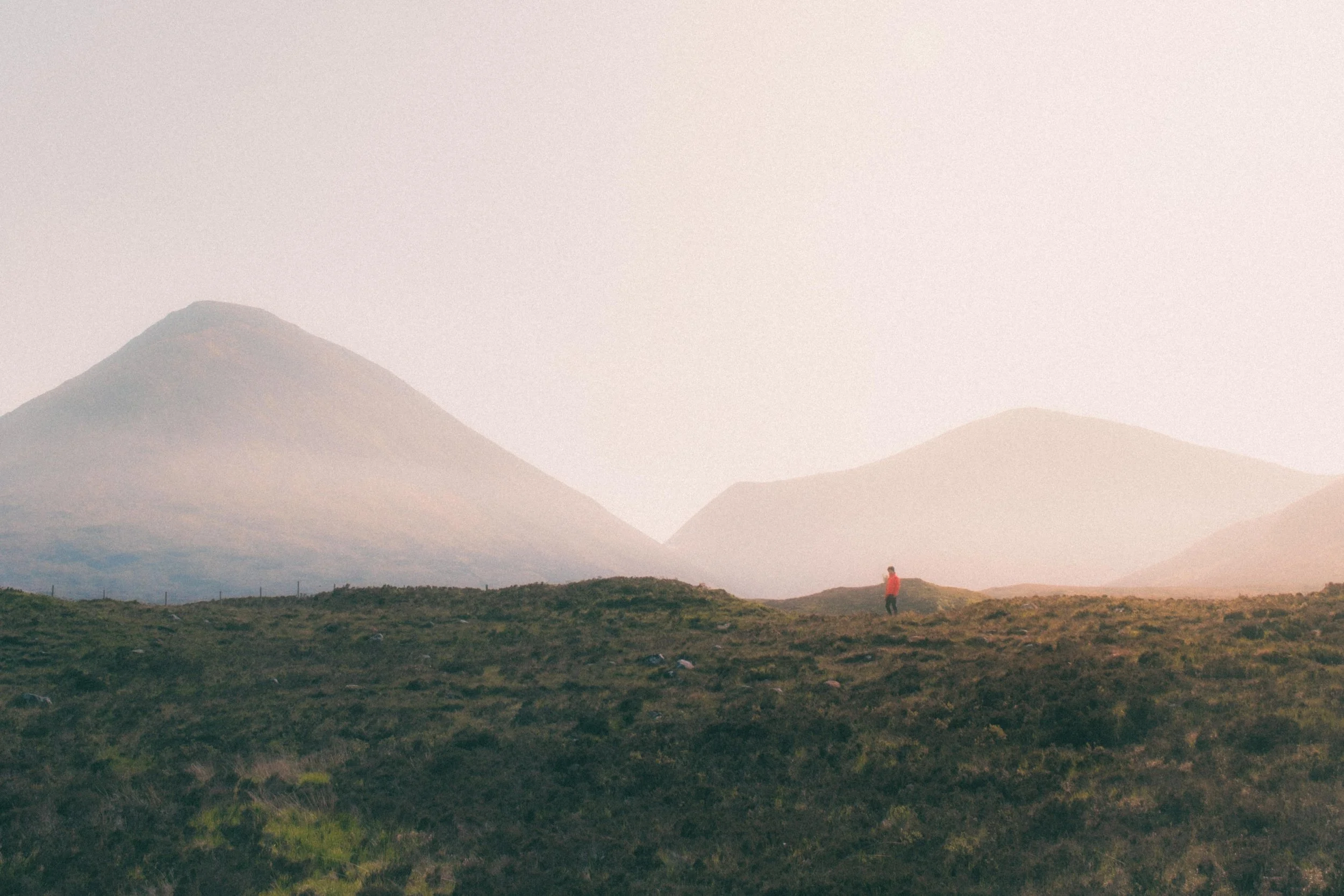 A person standing alone on a grassy plain with rolling hills and mountains in the background under a pale sky.