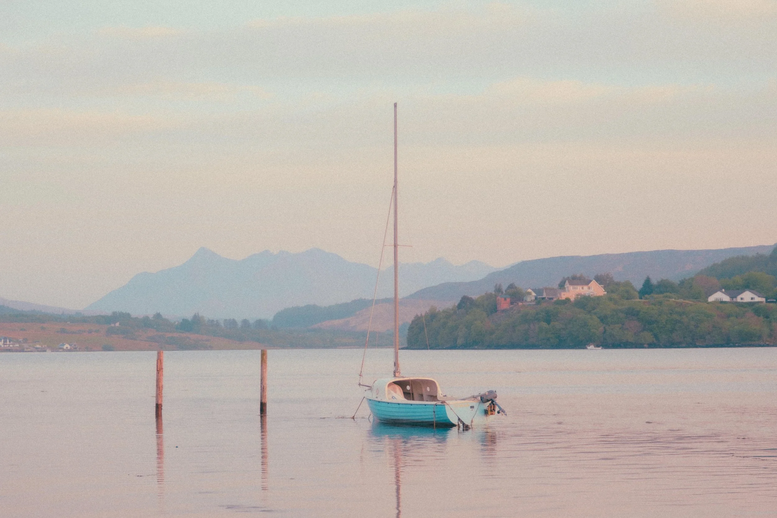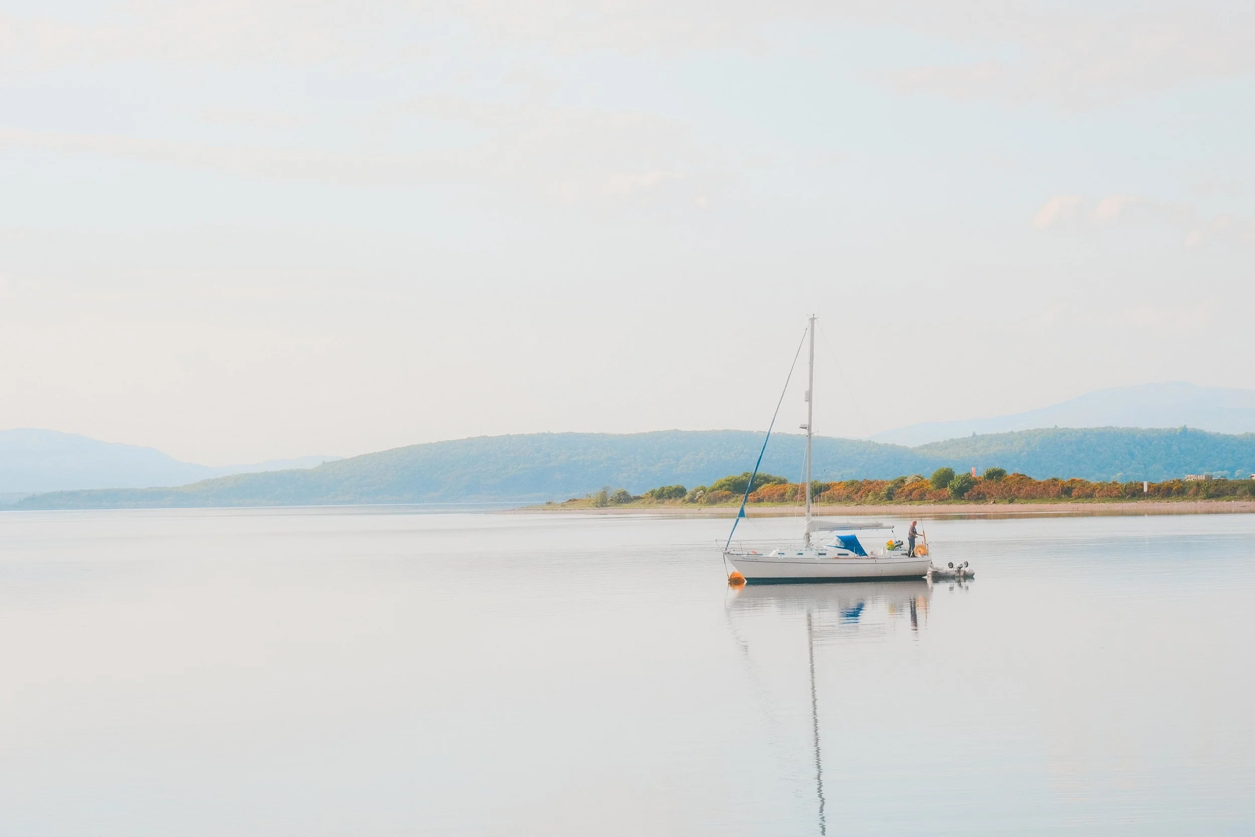 A sailboat floating on calm water near a distant shoreline with mountains in the background.