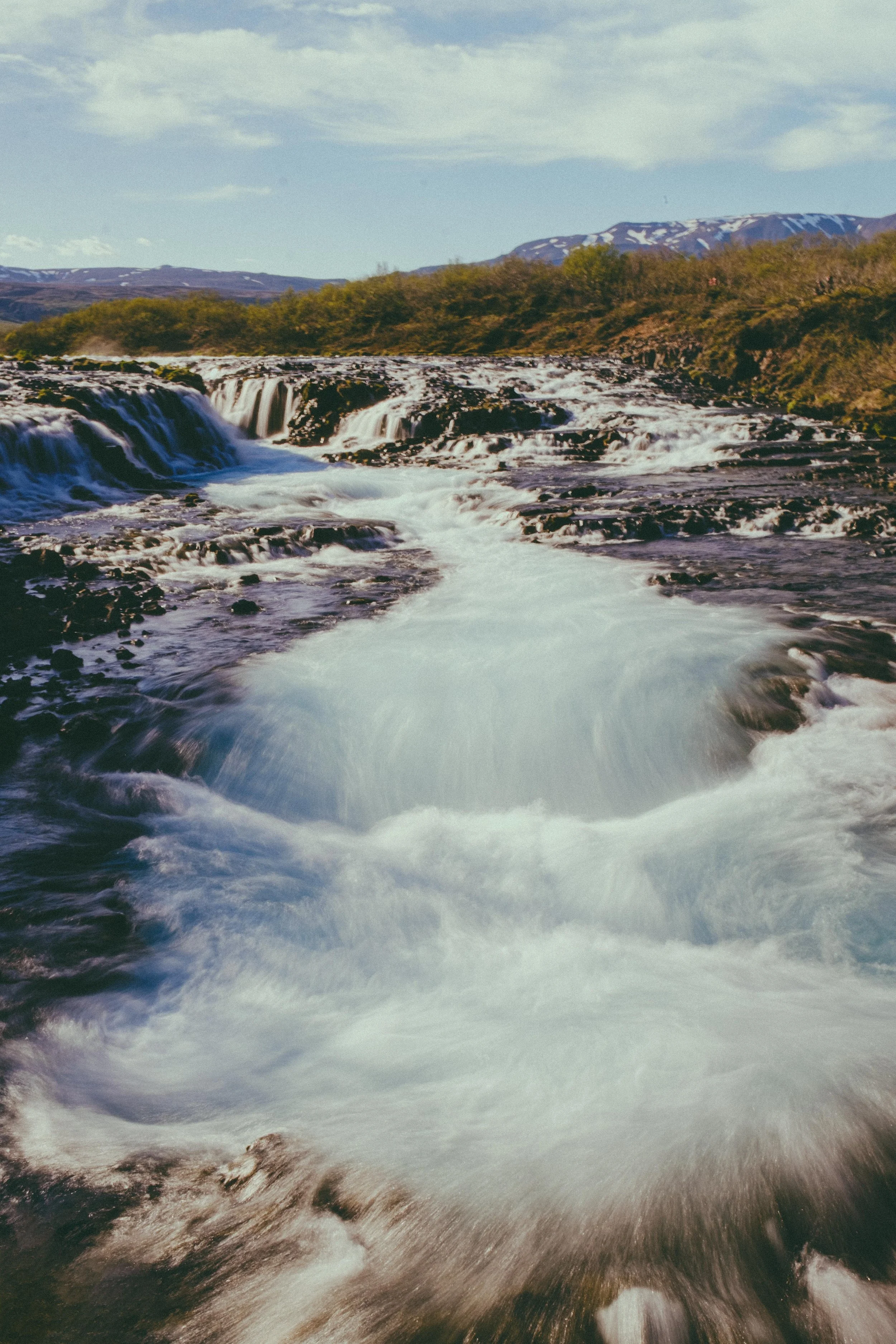 A wide view of a rushing river flowing over small waterfalls surrounded by green shrubbery and hills with snow-capped mountains in the distance under a partly cloudy sky.