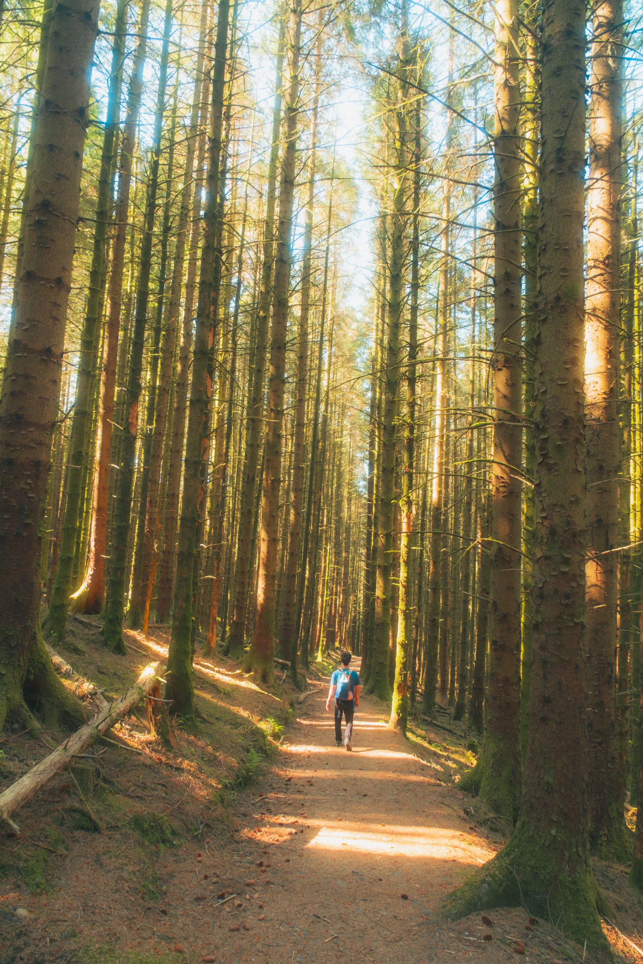 Person hiking on a dirt trail through a dense forest with tall trees and sunlight filtering through the leaves.