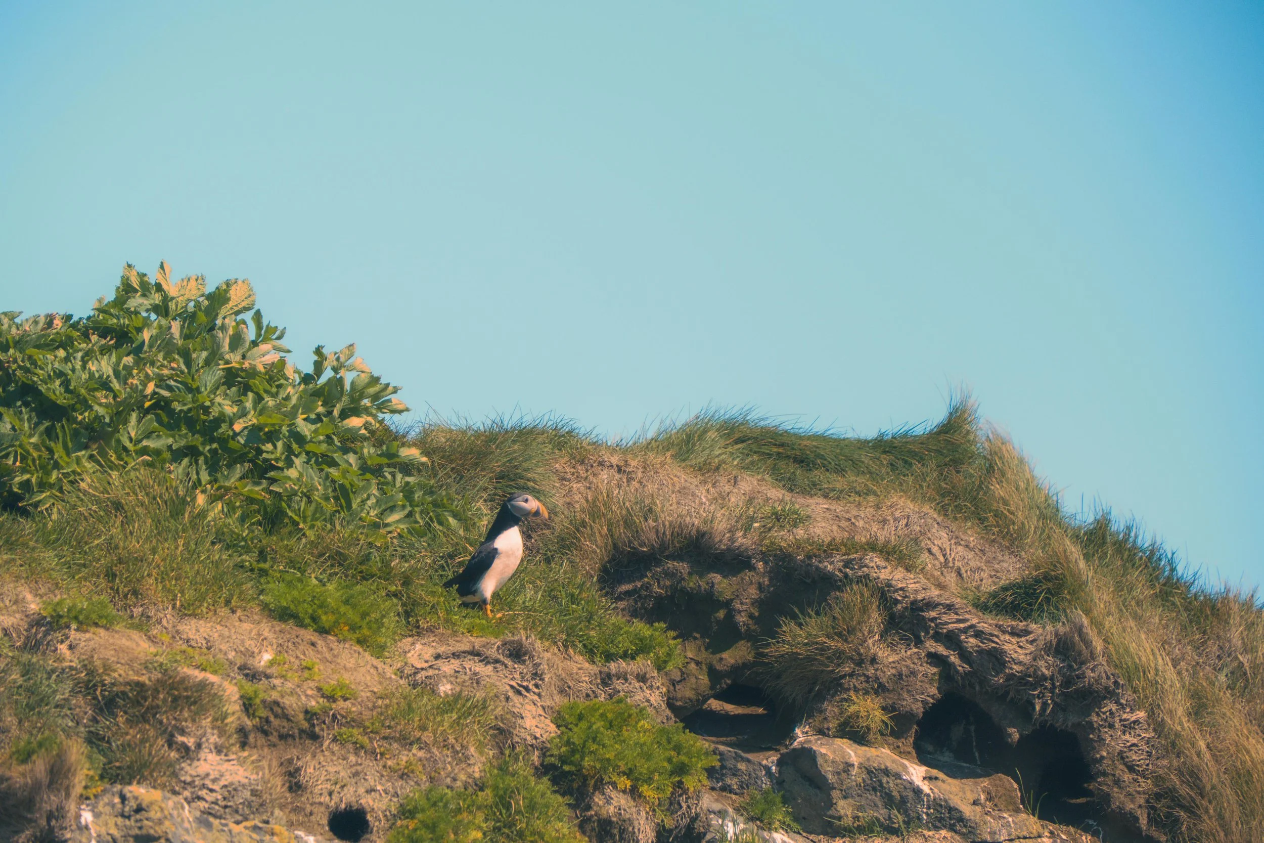 A puffin standing on a grassy rocky cliff with blue sky in the background.