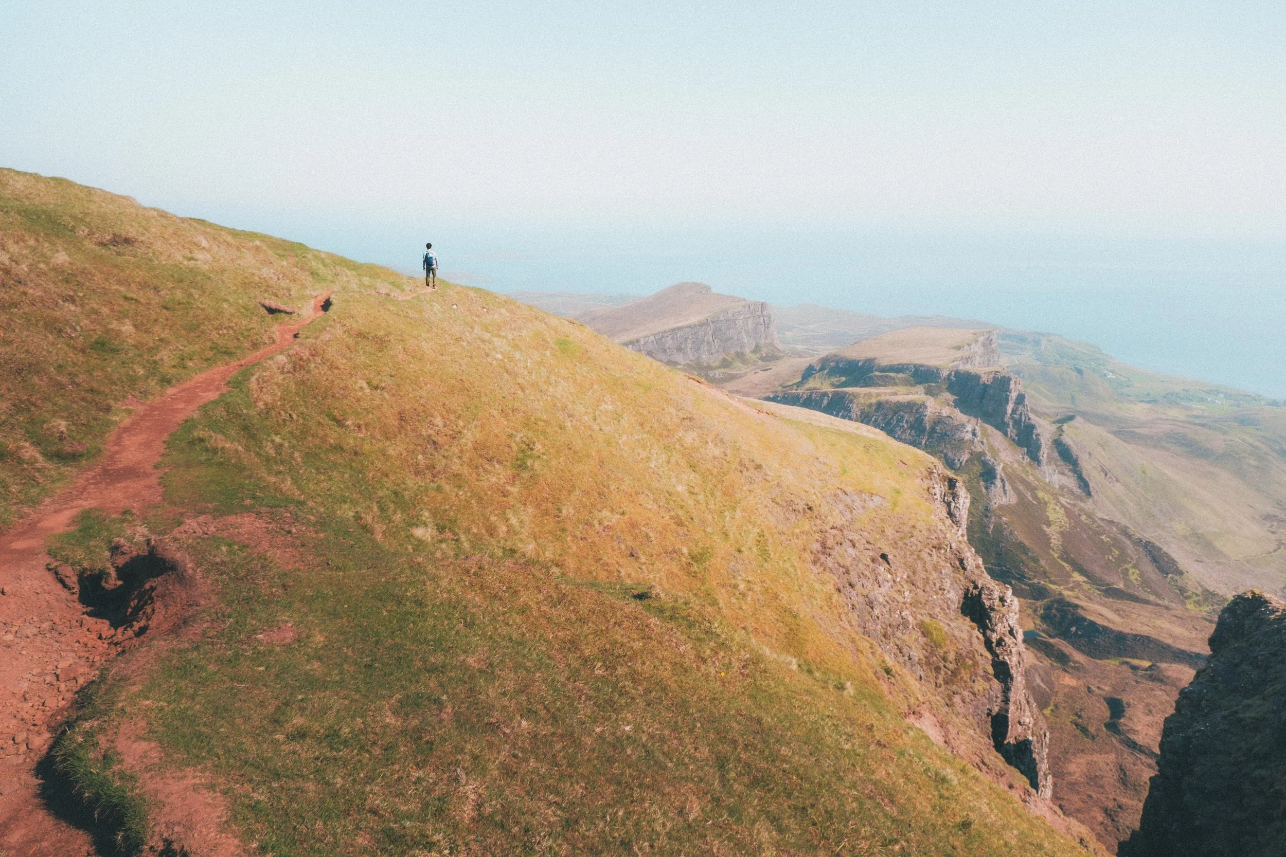 A person hiking on a narrow trail along a grassy hilltop in a rugged mountainous landscape with distant cliffs and a hazy sky.