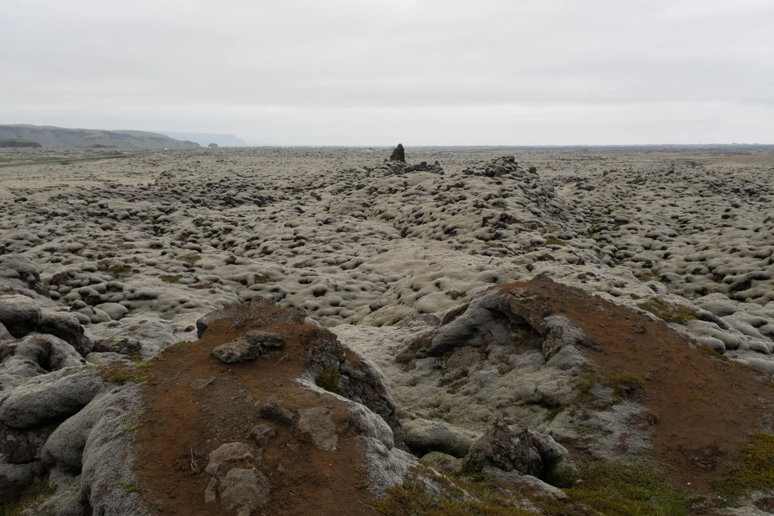 A vast, rugged landscape of gray, lumpy volcanic rocks under an overcast sky, with distant cliffs on the horizon.