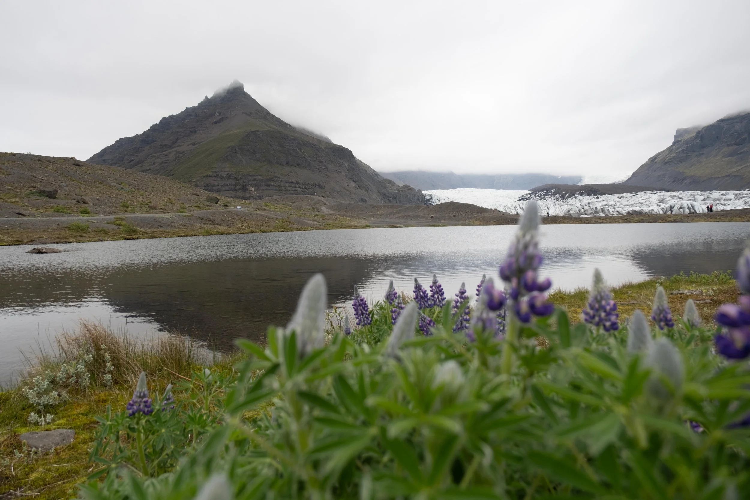A scenic view of a lake with purple wildflowers in the foreground, mountains, and a glacier in the background under a cloudy sky.
