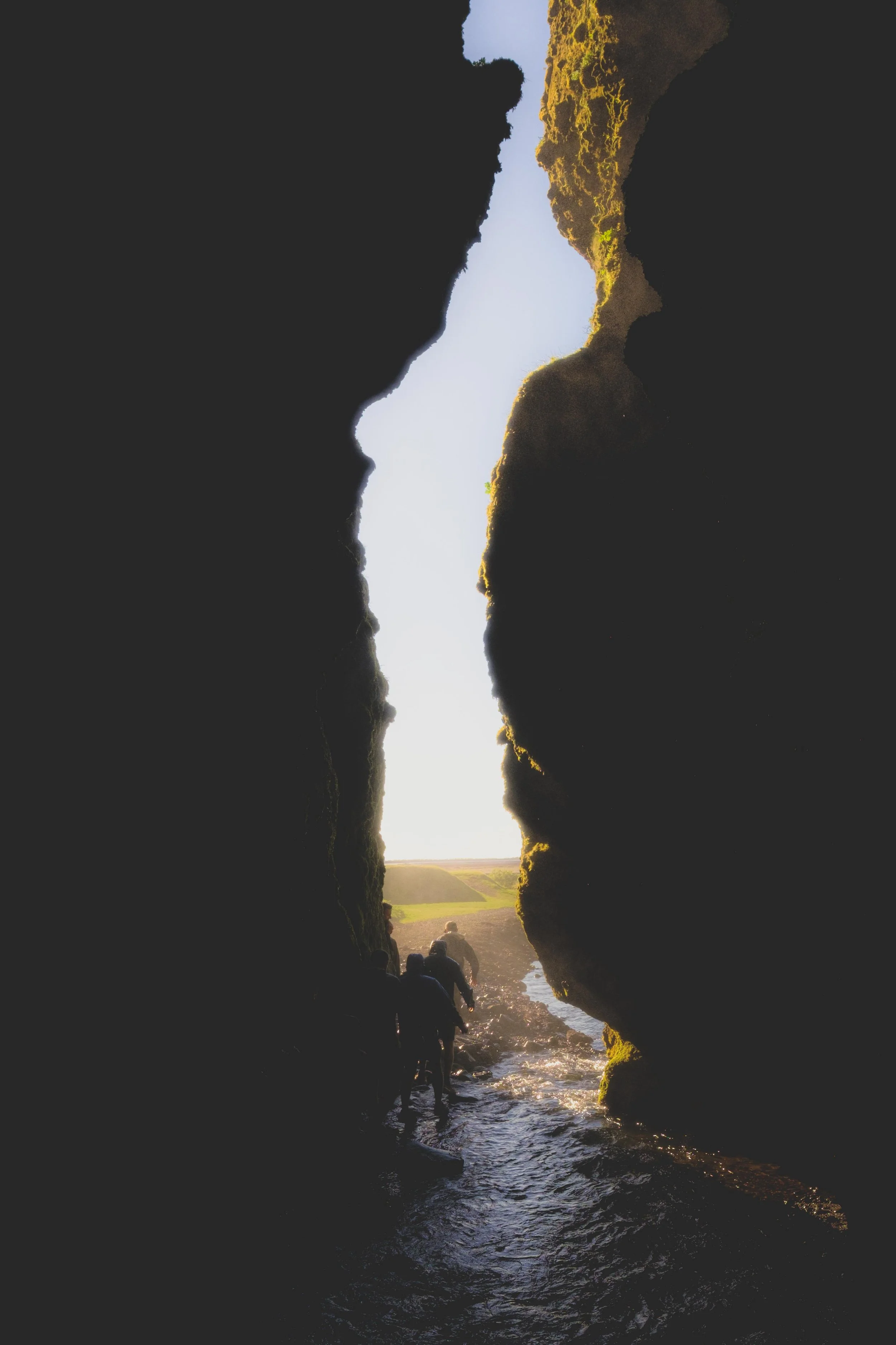 View from inside a dark cave looking toward the bright outside, showing a narrow water path with people walking along it, surrounded by moss-covered rocks and lush green landscape.