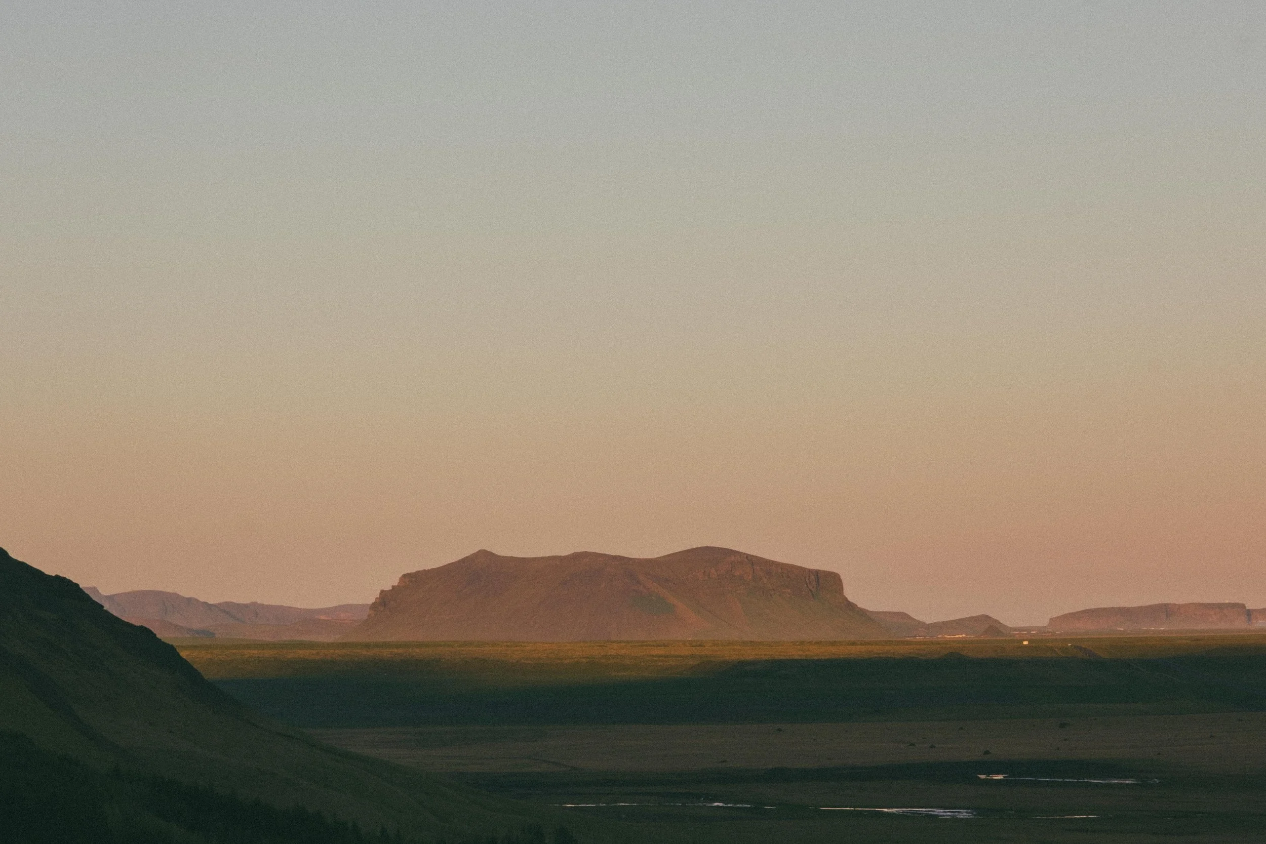 A vast landscape with a large flat-topped mountain in the distance, under a clear pastel-colored sky.