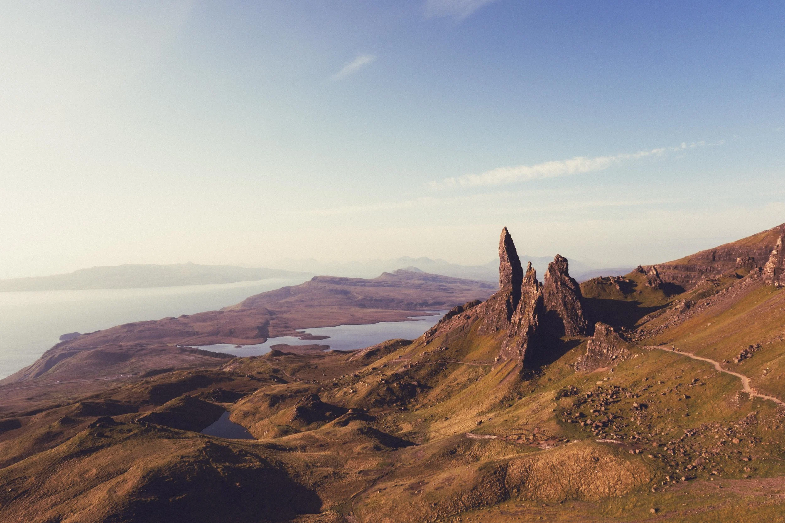 Scenic view of the rocky, green hills and distinctive rock formations of the Old Man of Storr on the Isle of Skye, with a water body and distant mountains in the background under a clear blue sky.