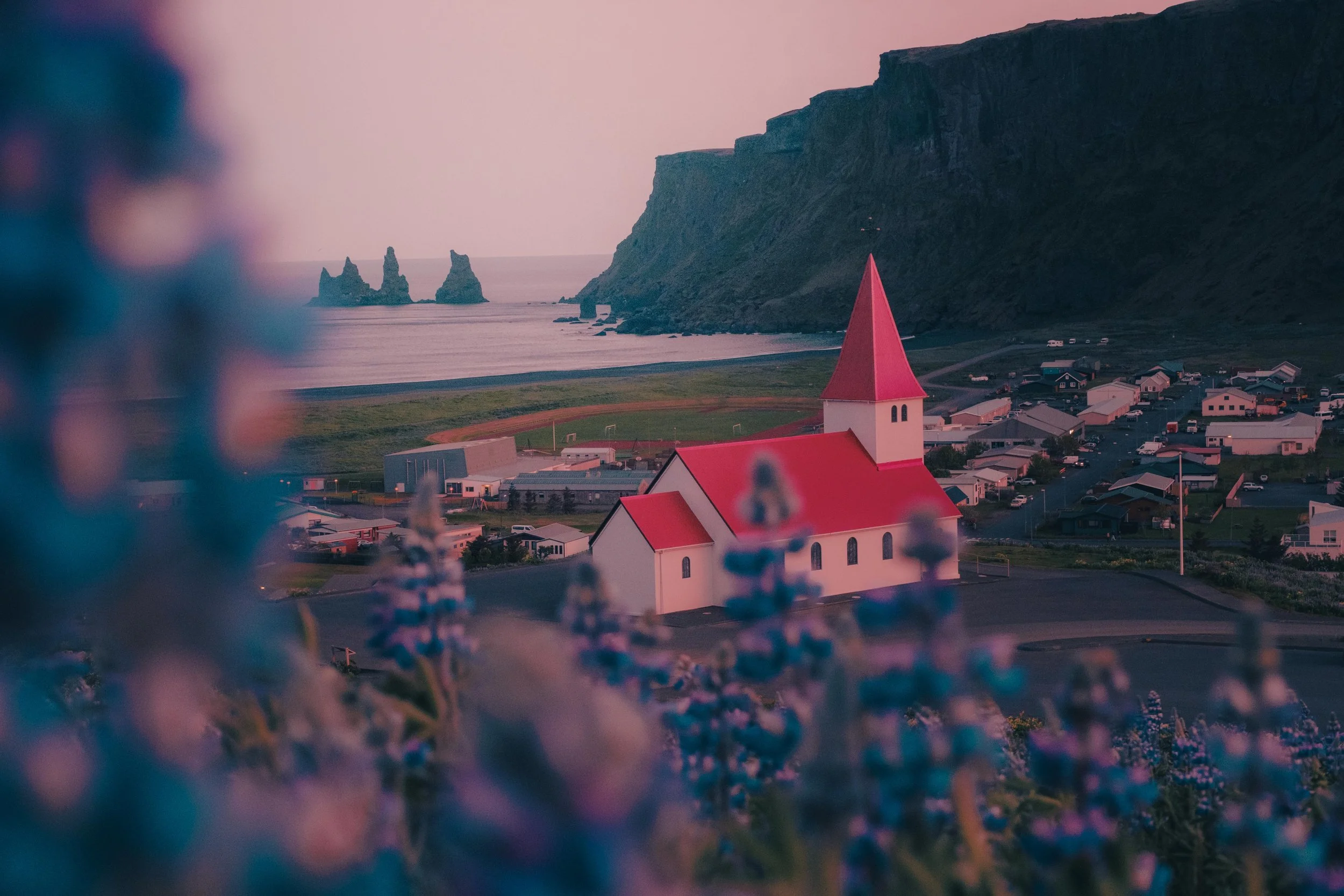 A village with a white church that has red roofs and a tall steeple, surrounded by houses, set against a background of green cliffs and rock formations by the ocean, during sunset.