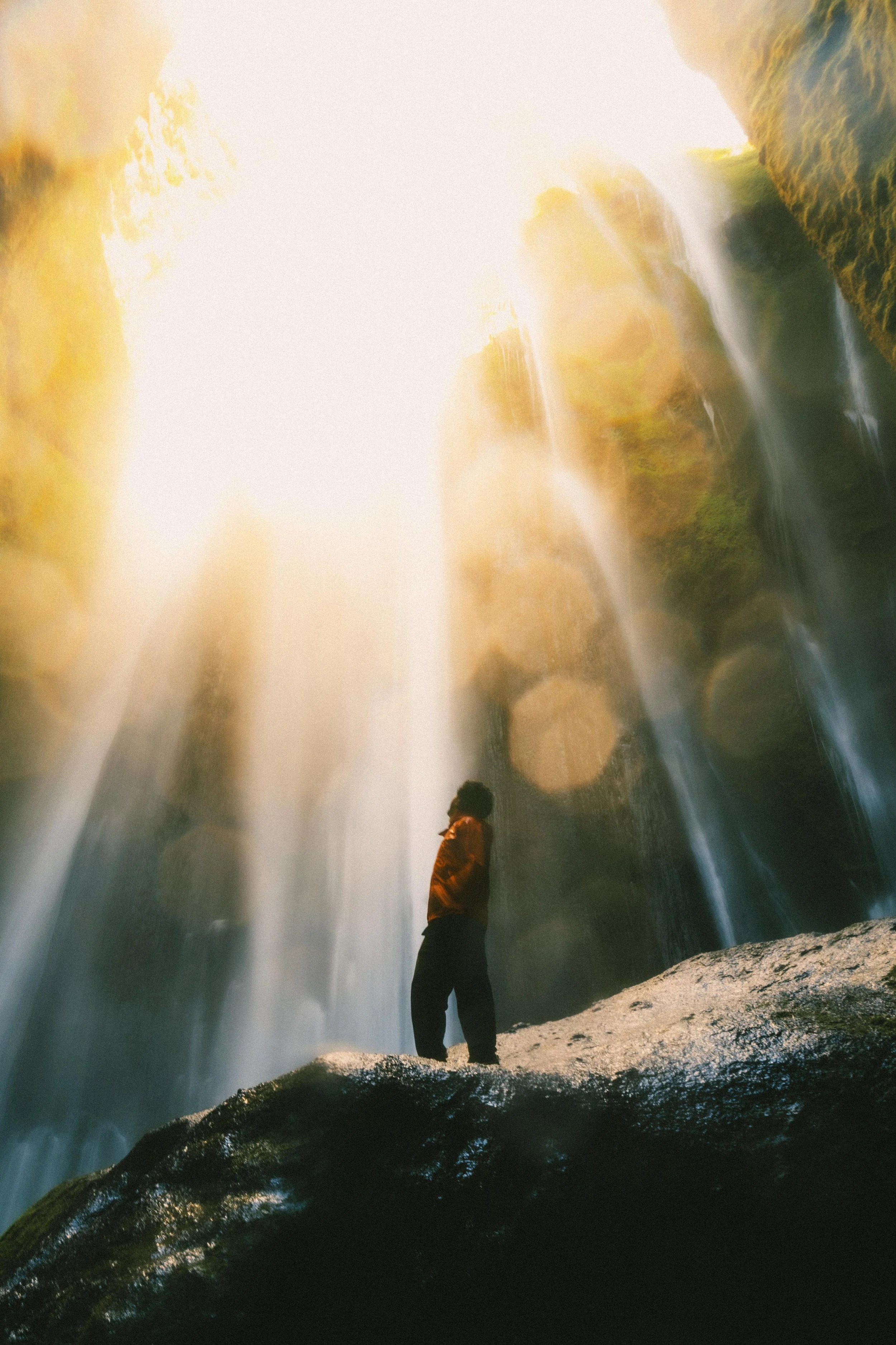 Person standing on a rock at the base of a waterfall with intense sunlight illuminating the mist and cascades.