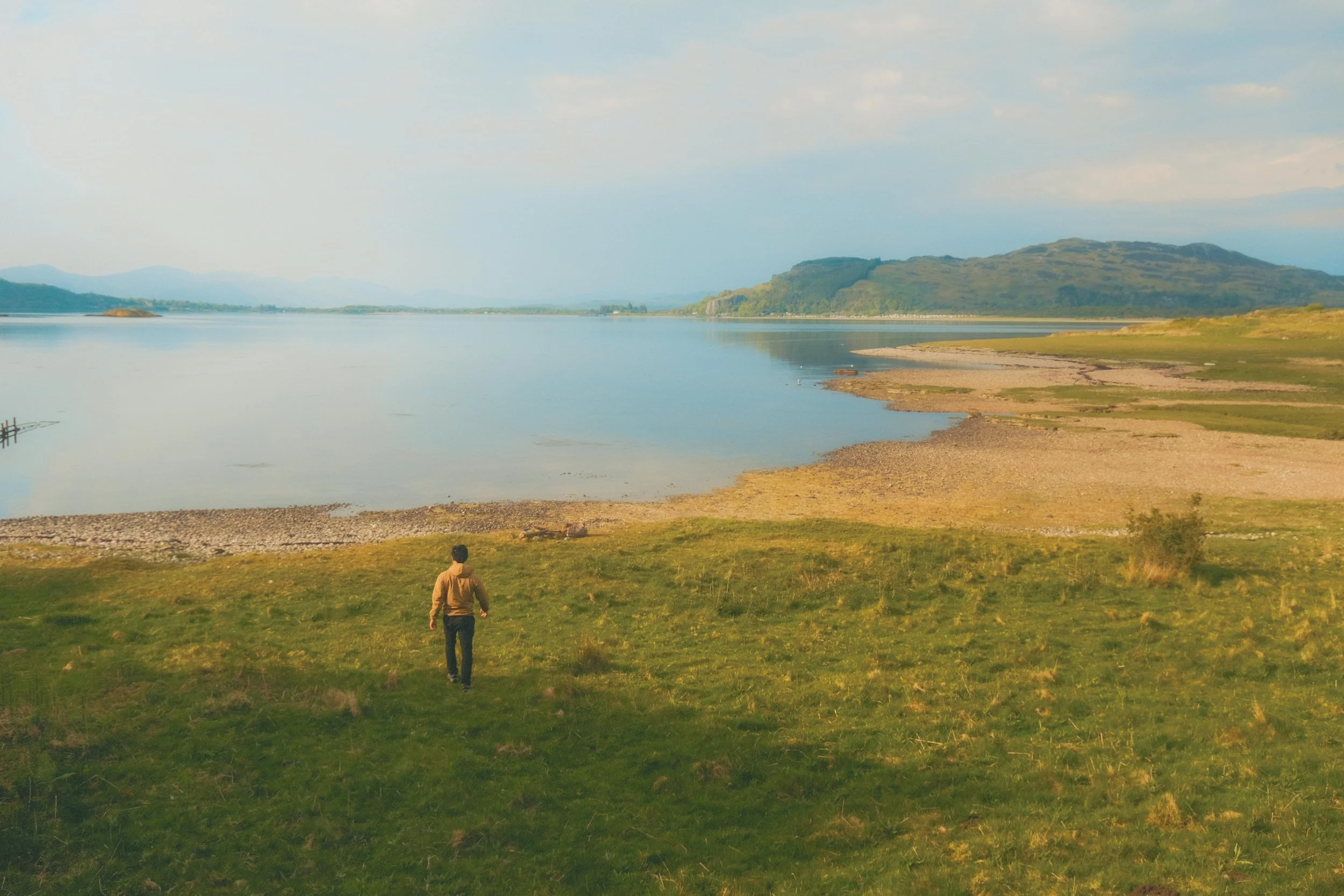 A solitary man walking on green grass near a calm body of water, with some patches of land and mountains in the background under a partly cloudy sky.