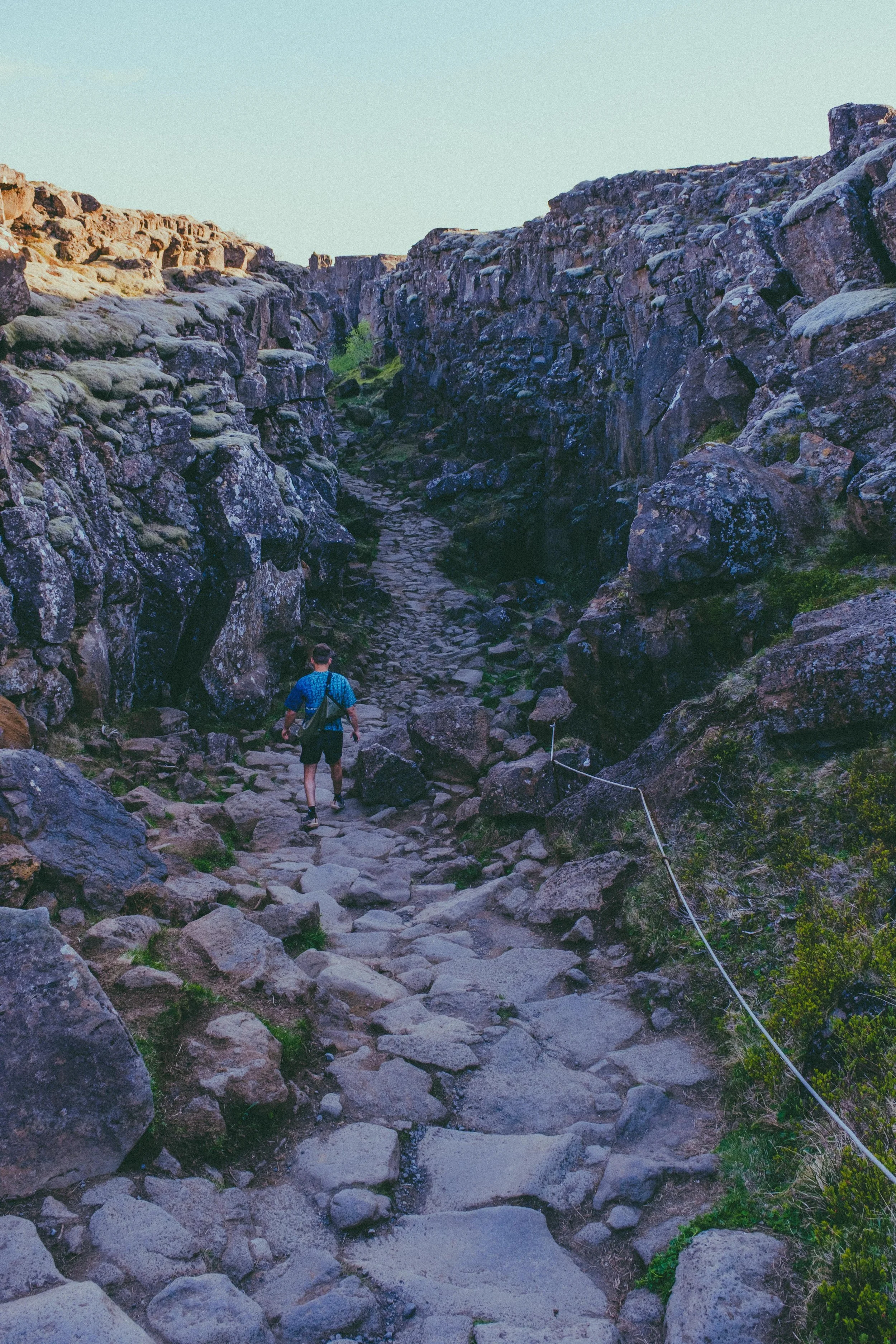 A hiker walking along a rocky trail between tall rugged cliff walls on a mountain path.