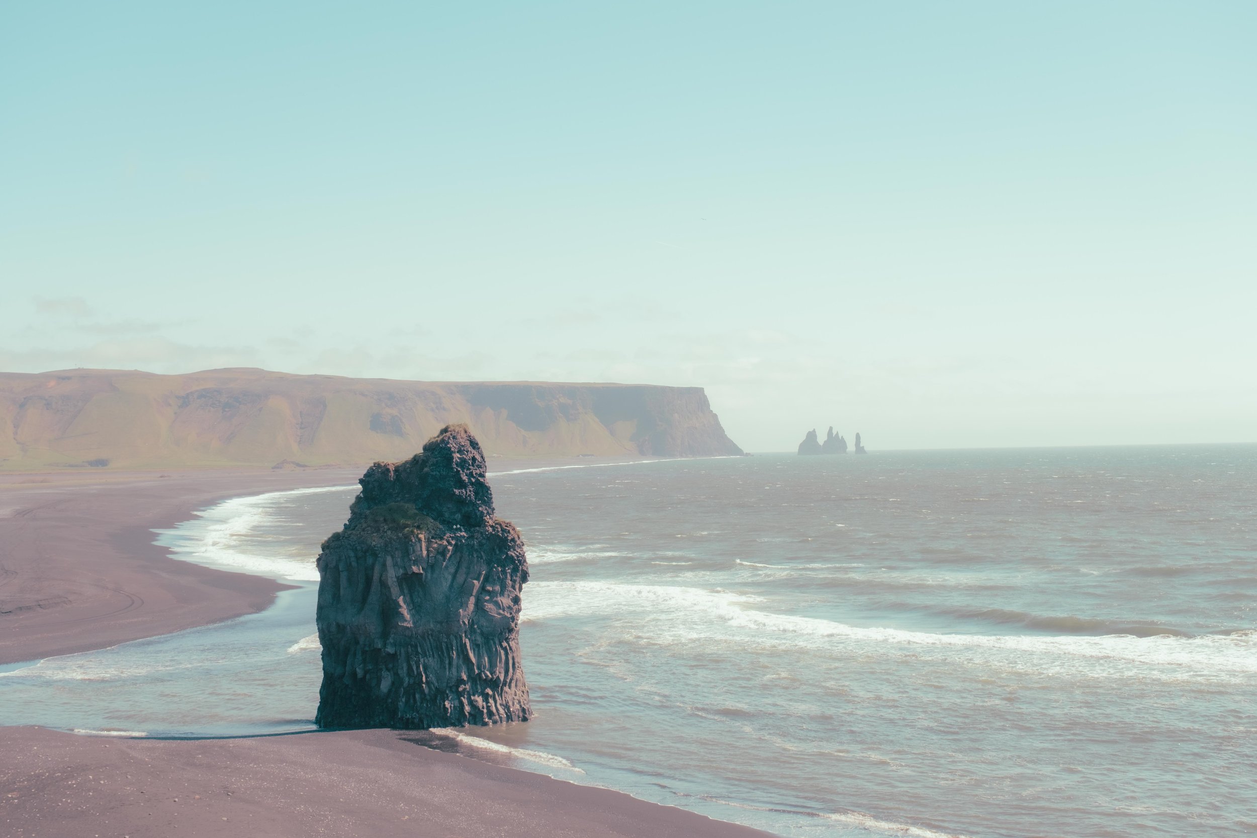 A rocky sea stack on a black sandy beach with cliffs in the background and the ocean.