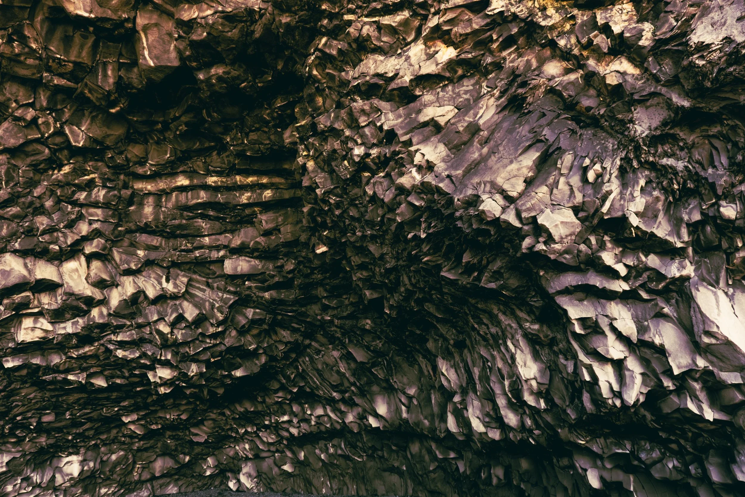 Close-up of dark purple and black jagged rock formations, resembling a cave ceiling.
