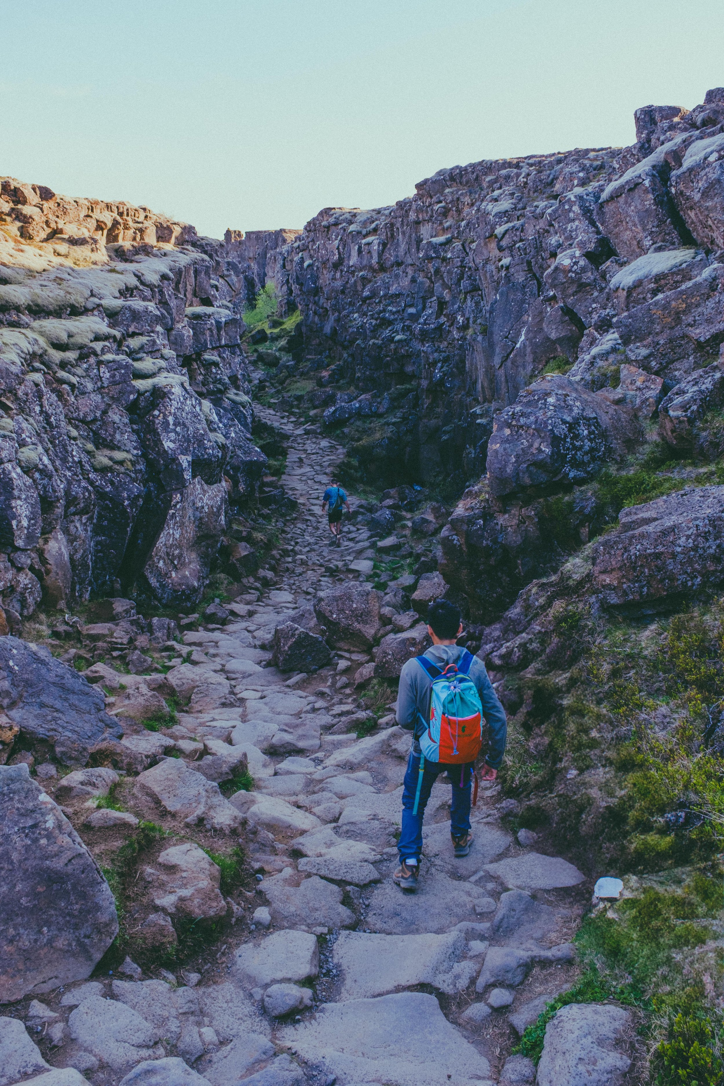 Two hikers with backpacks walking on a rocky trail between high cliffs with sparse vegetation.