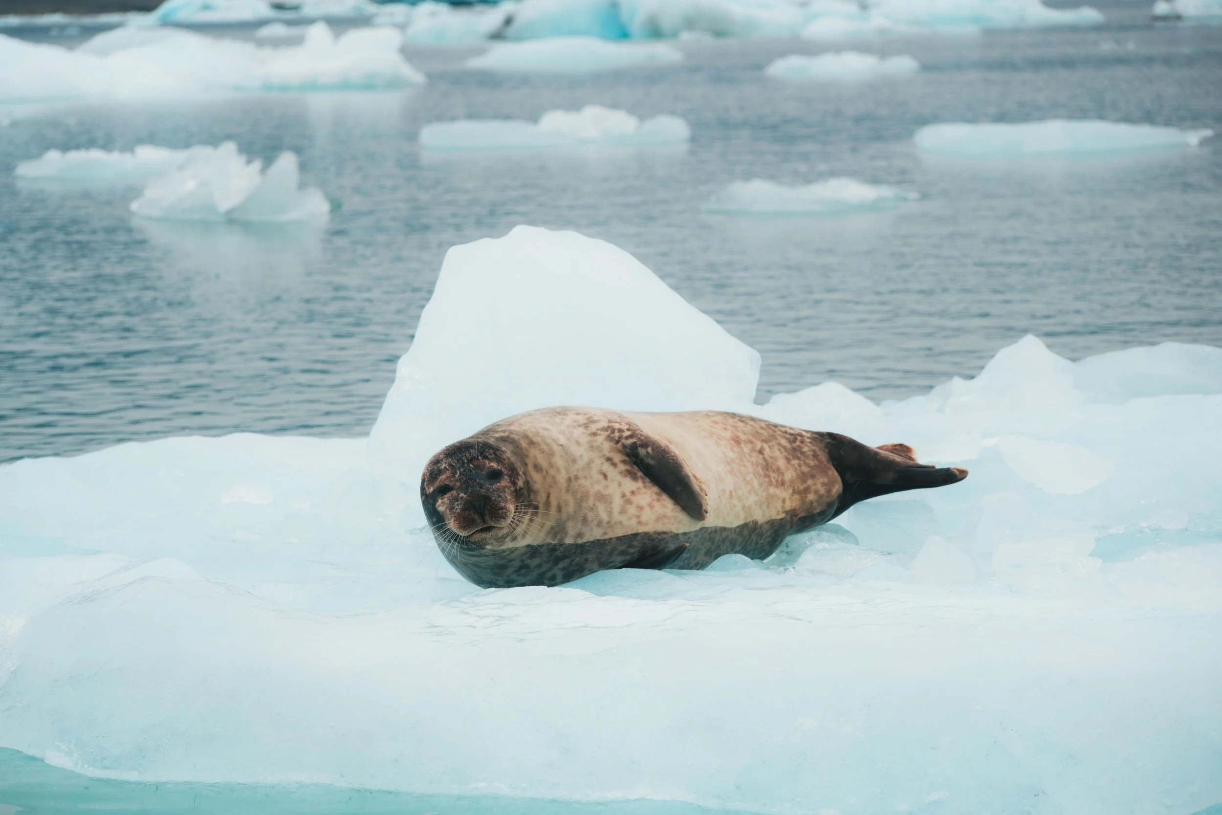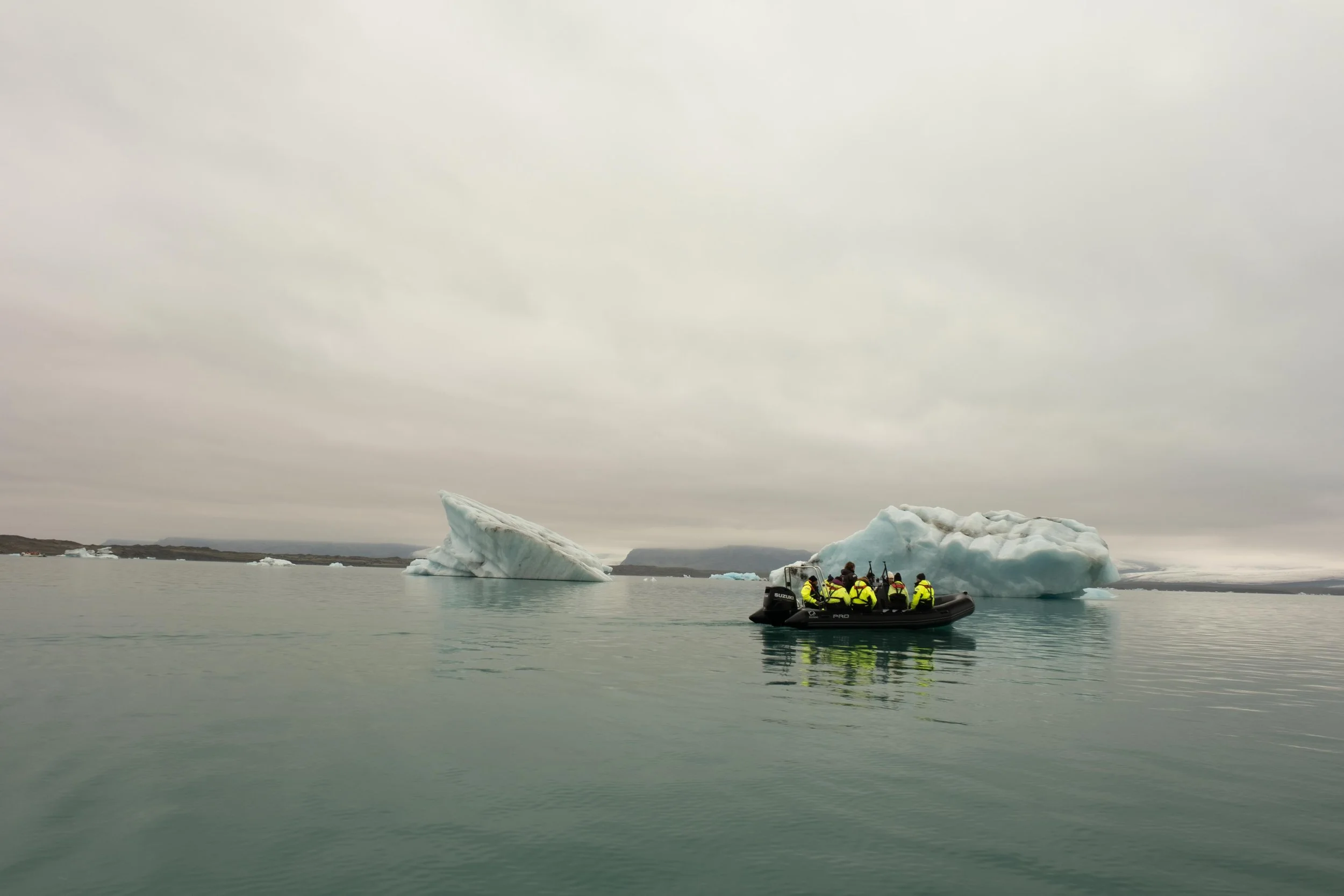 A boat with multiple passengers wearing yellow life jackets speeding across icy water, with icebergs and a barren hillside in the background.