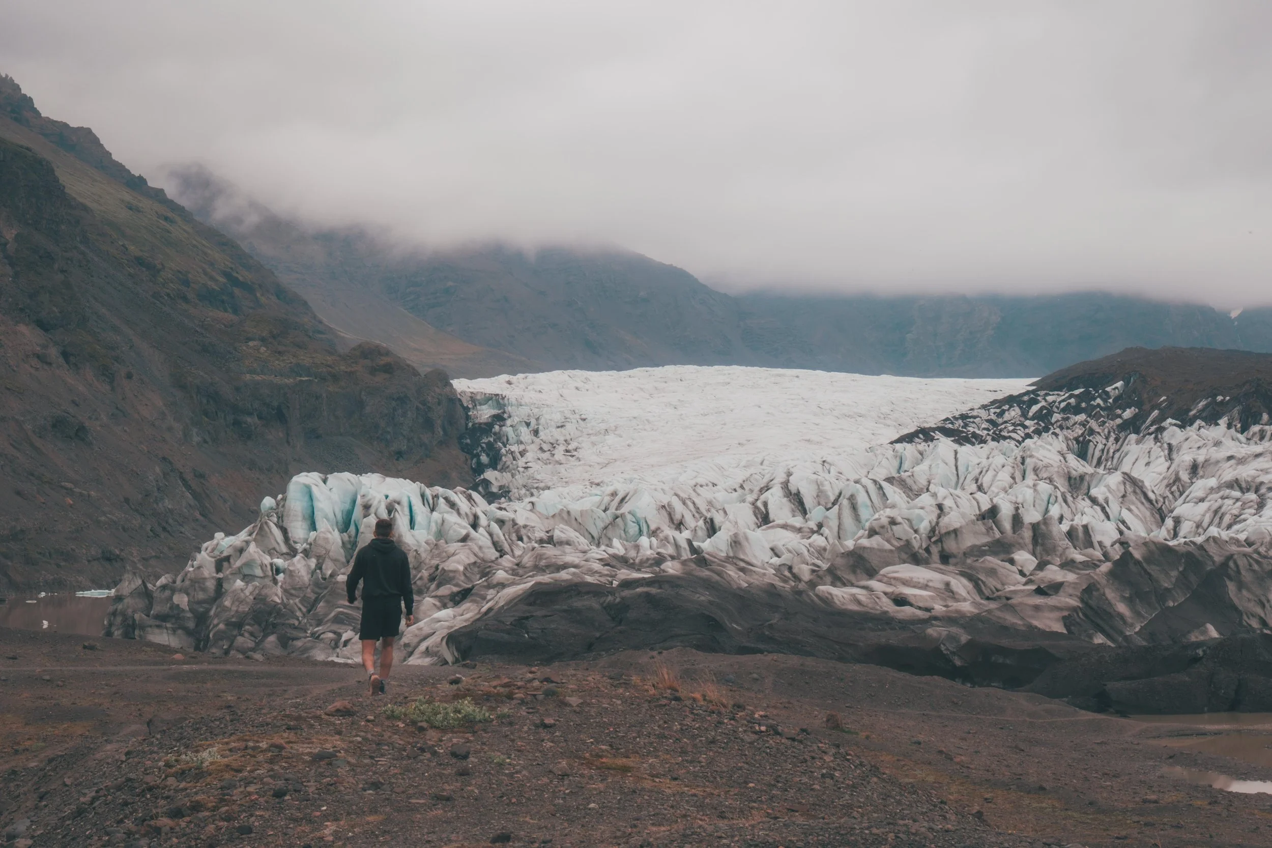 Person walking towards a glacier in a mountainous landscape under cloudy sky