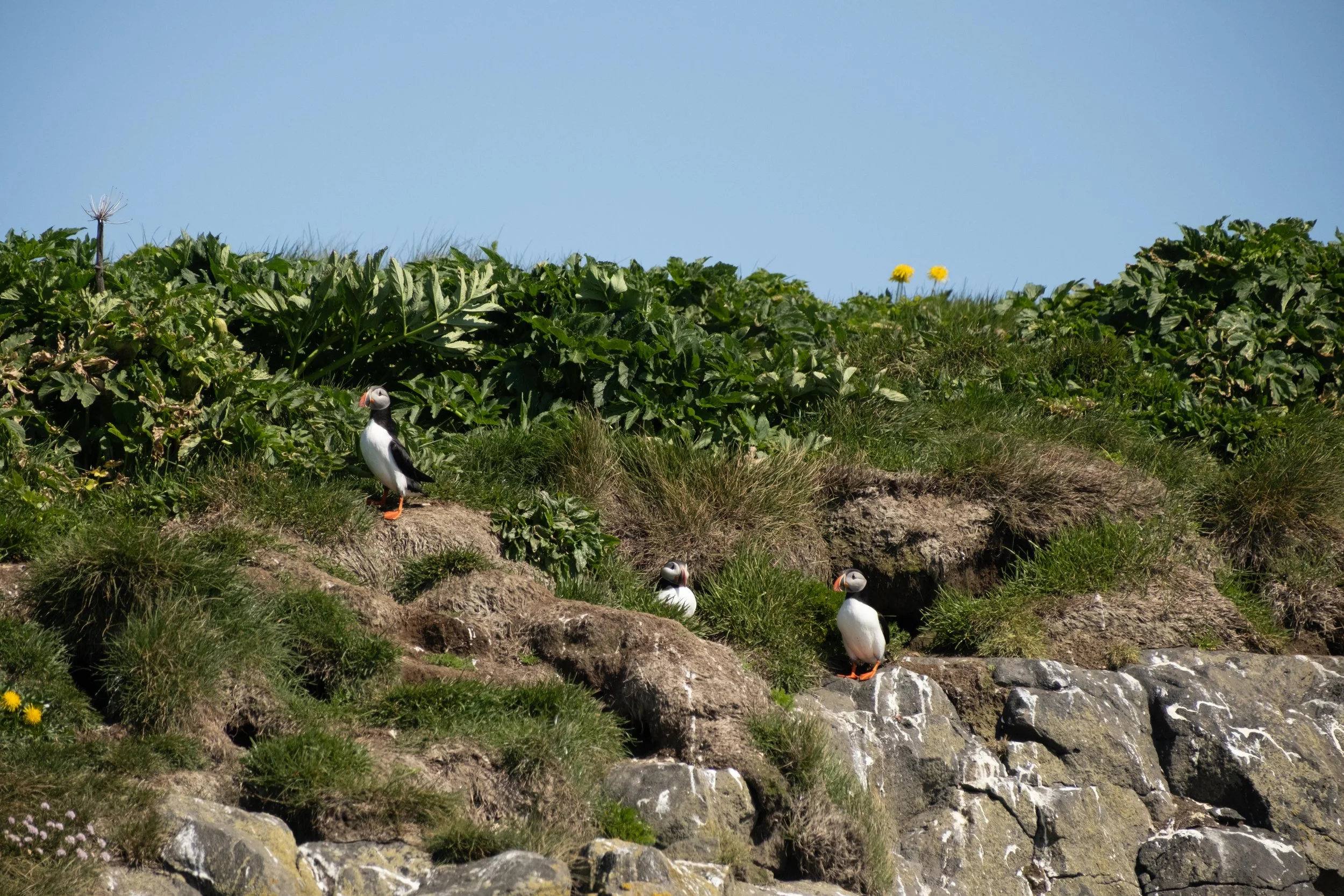 Three puffin birds standing on rocks and grassy terrain near a green bush and yellow flowers under a clear blue sky.