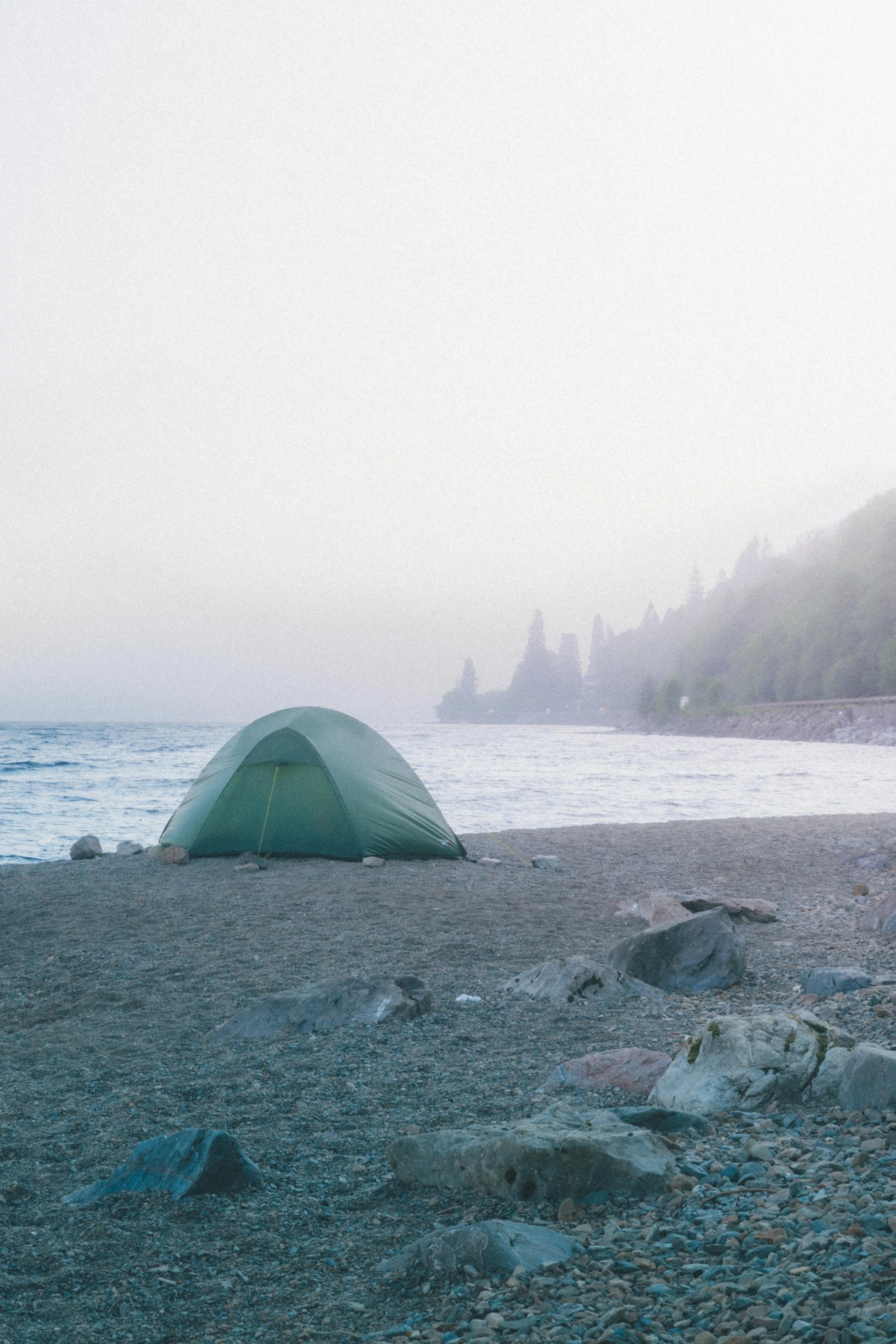 A green tent set up on a rocky beach near the water with a foggy, tree-covered coastline in the background.