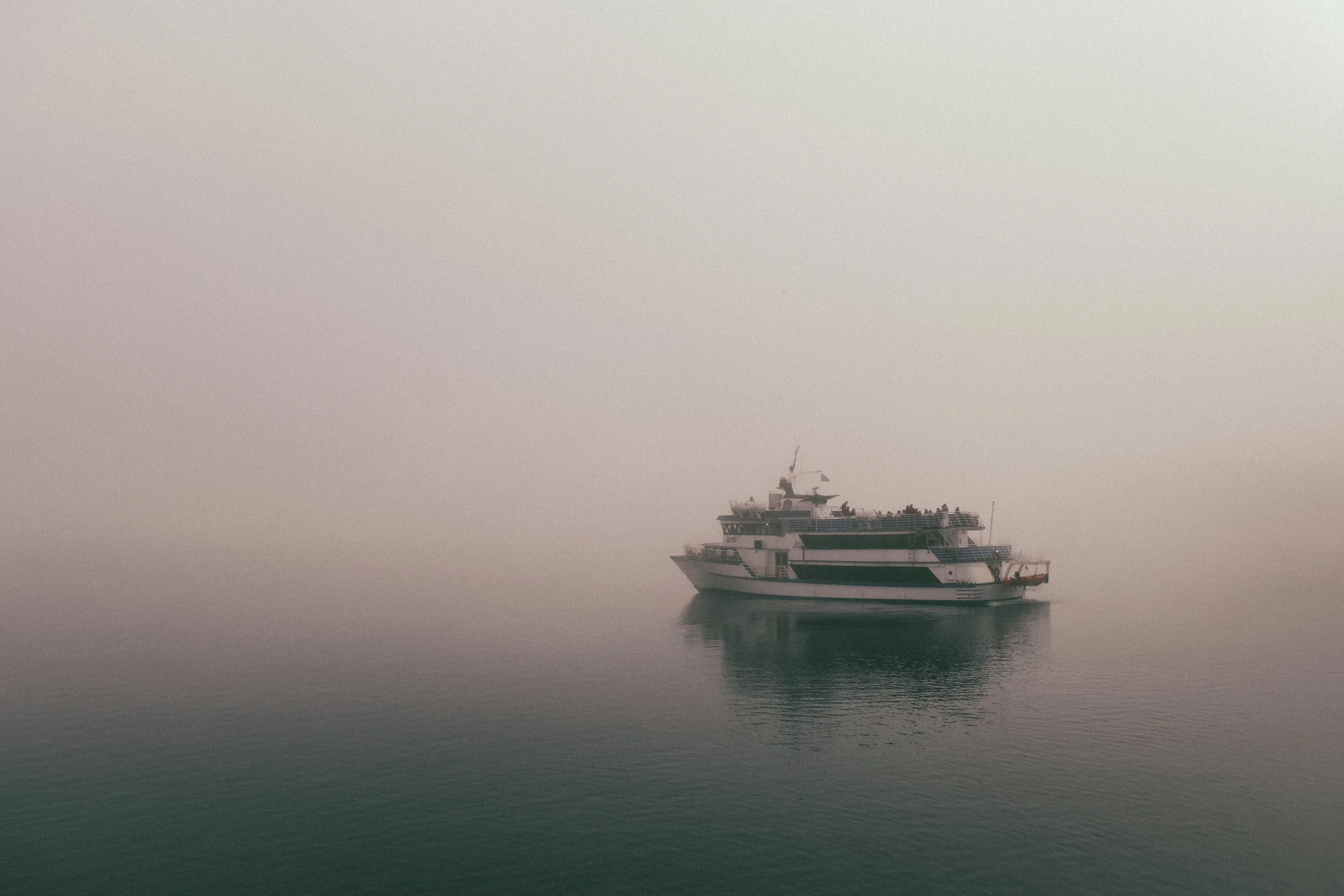 A large boat is floating on calm water, shrouded in fog with minimal visibility.