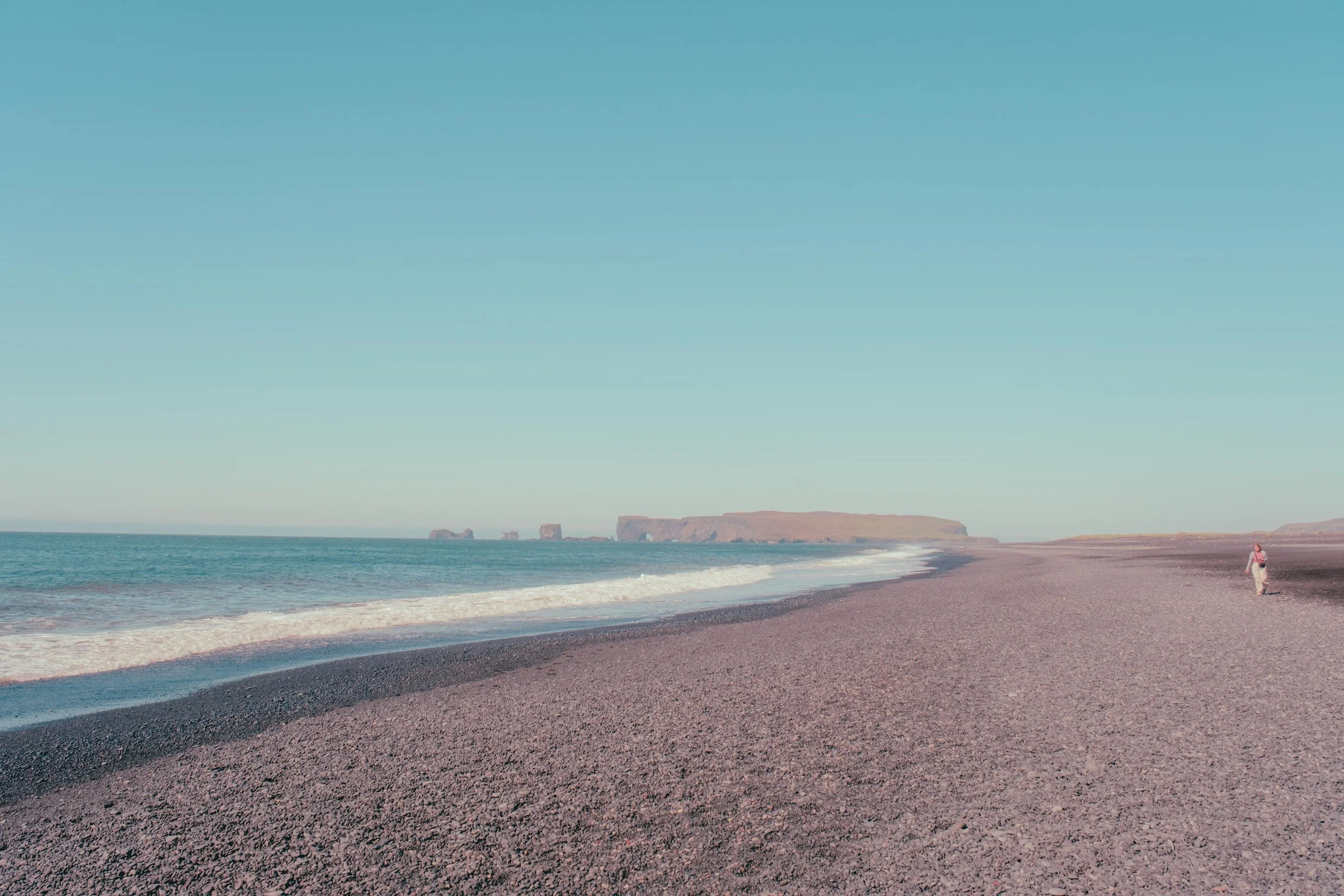 A person walking alone on a pebble beach with the ocean on one side and cliffs in the distance under a clear blue sky.