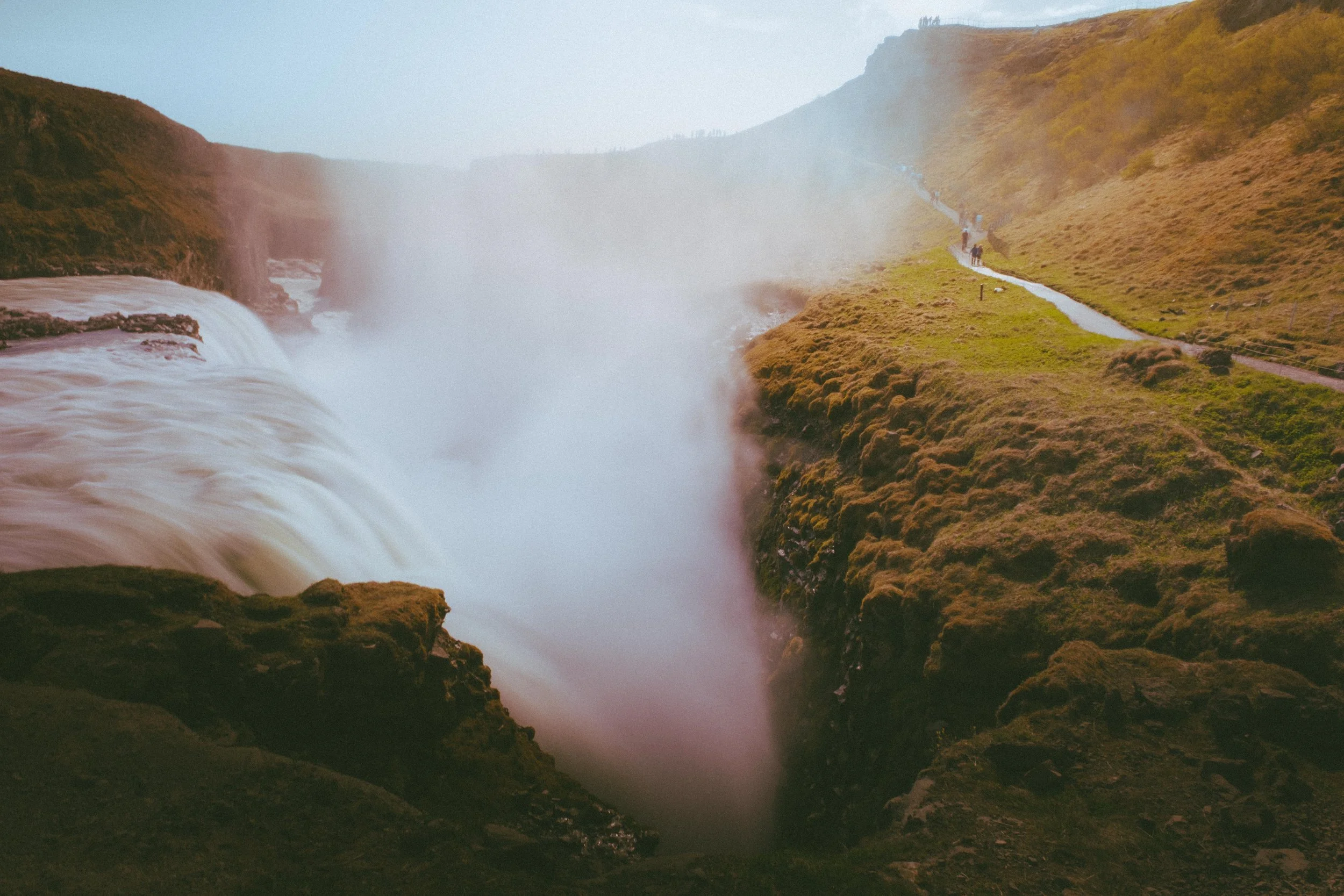 Gullfoss waterfall in Iceland with a narrow trail and a few hikers on the right side of the image.