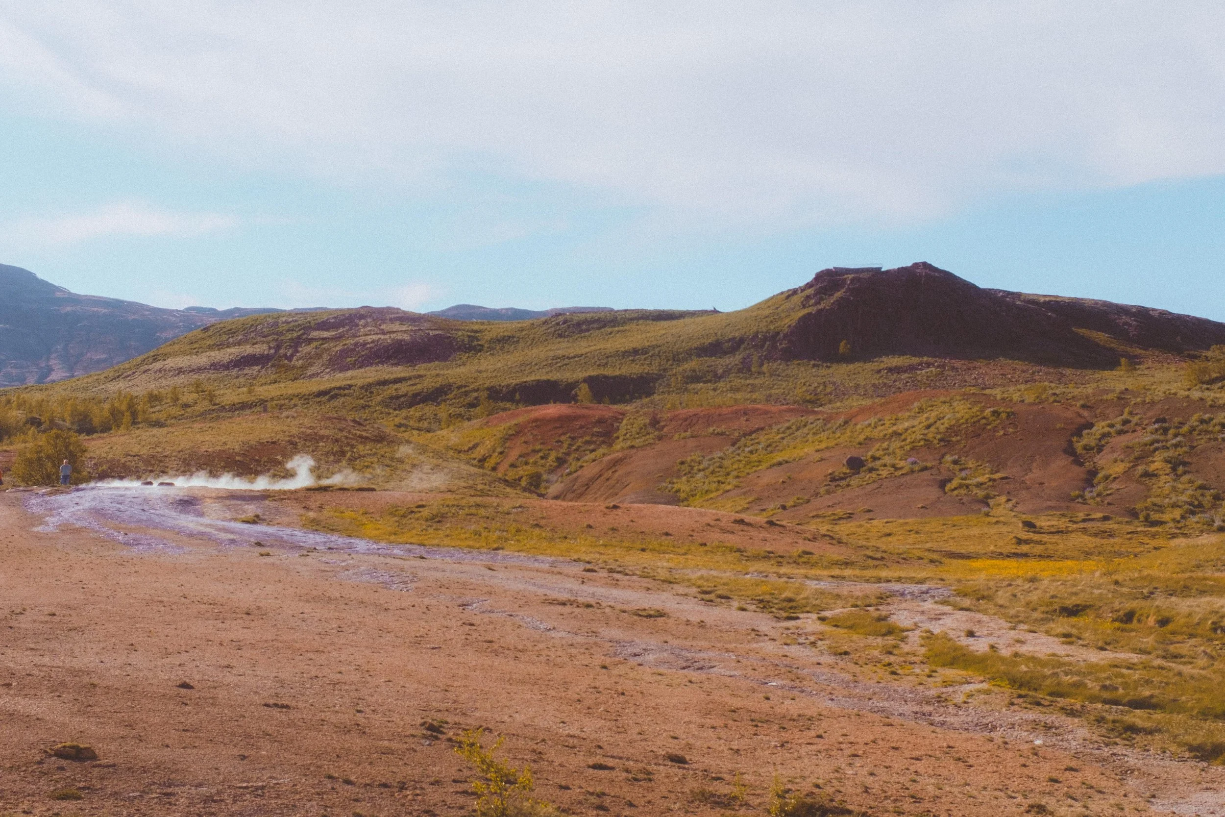 A vast, arid landscape with reddish-brown dirt and sparse vegetation, rolling hills in the background, and steam rising from the ground, under a partly cloudy sky.