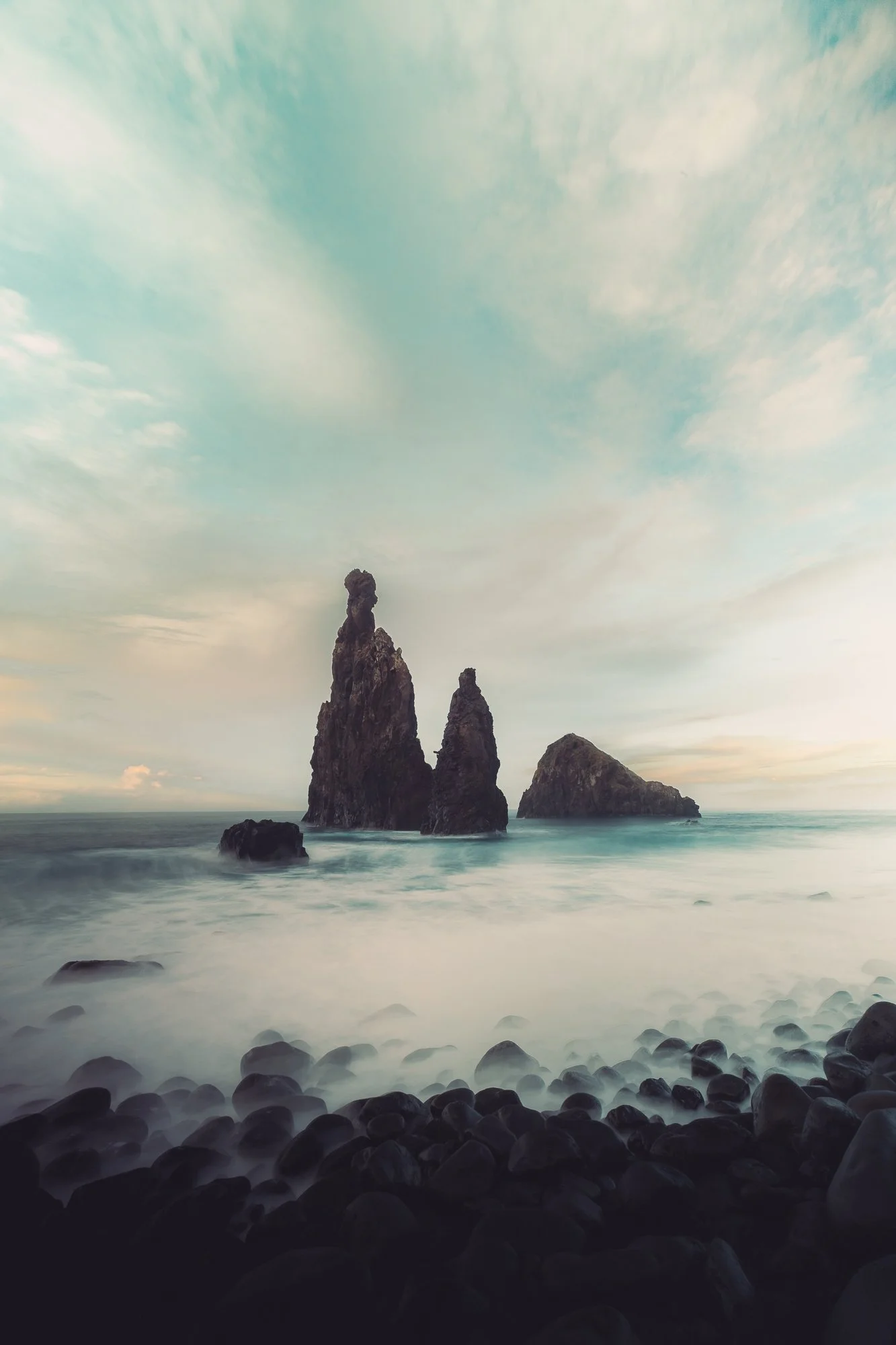 Sea stacks rising from ocean with rocks on the shore and a cloudy sky.