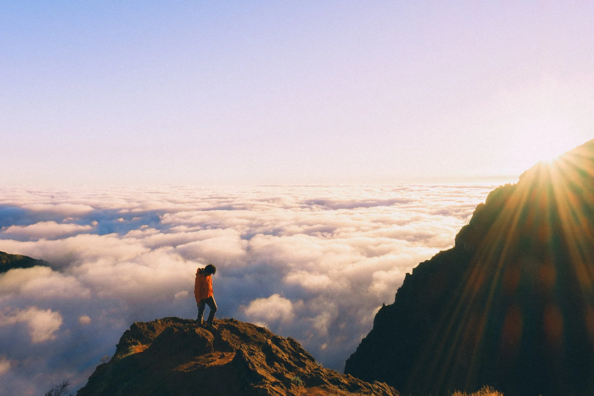 A person in an orange jacket standing on a mountain peak above clouds at sunrise or sunset with sun rays shining over the horizon.