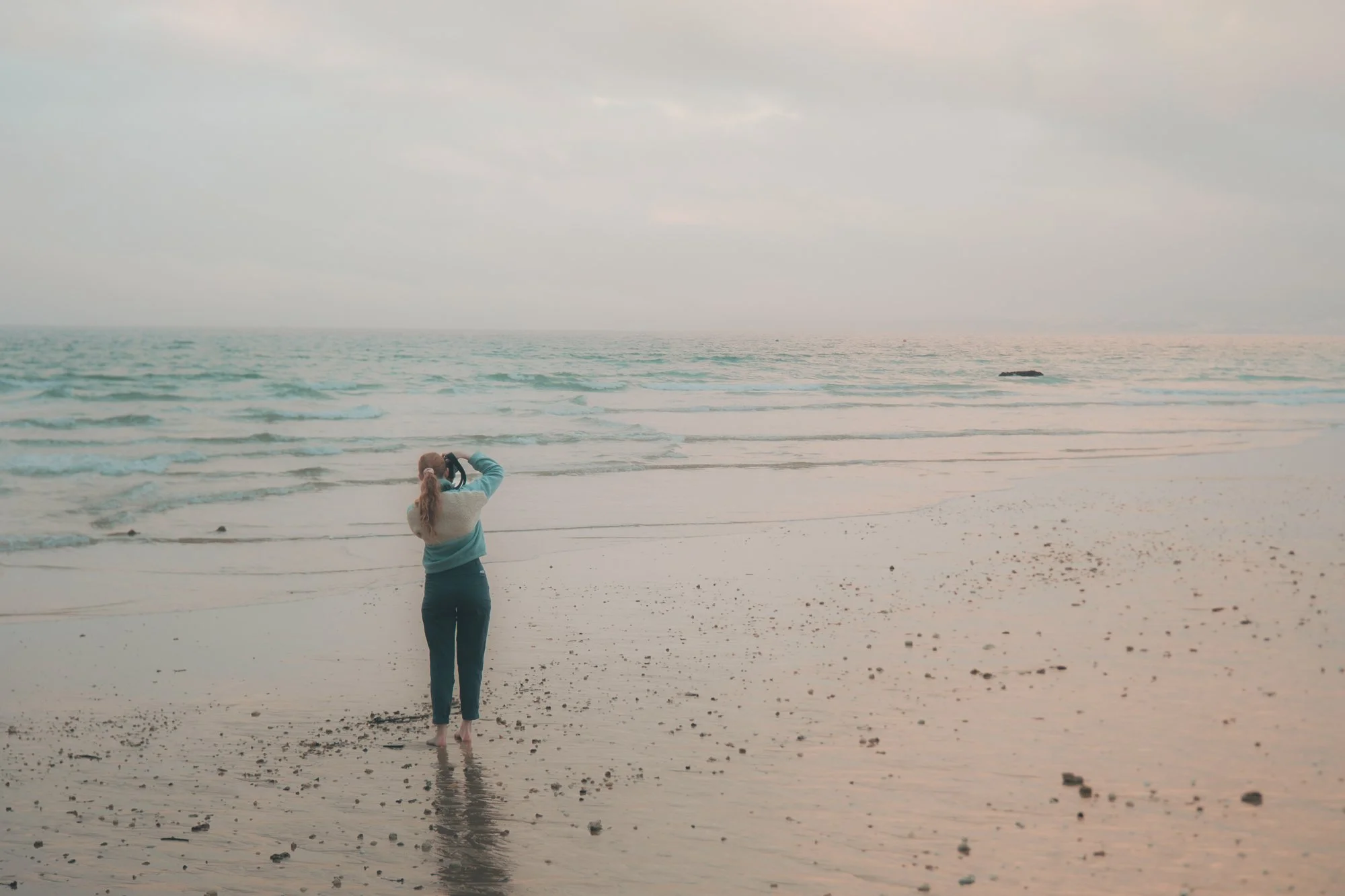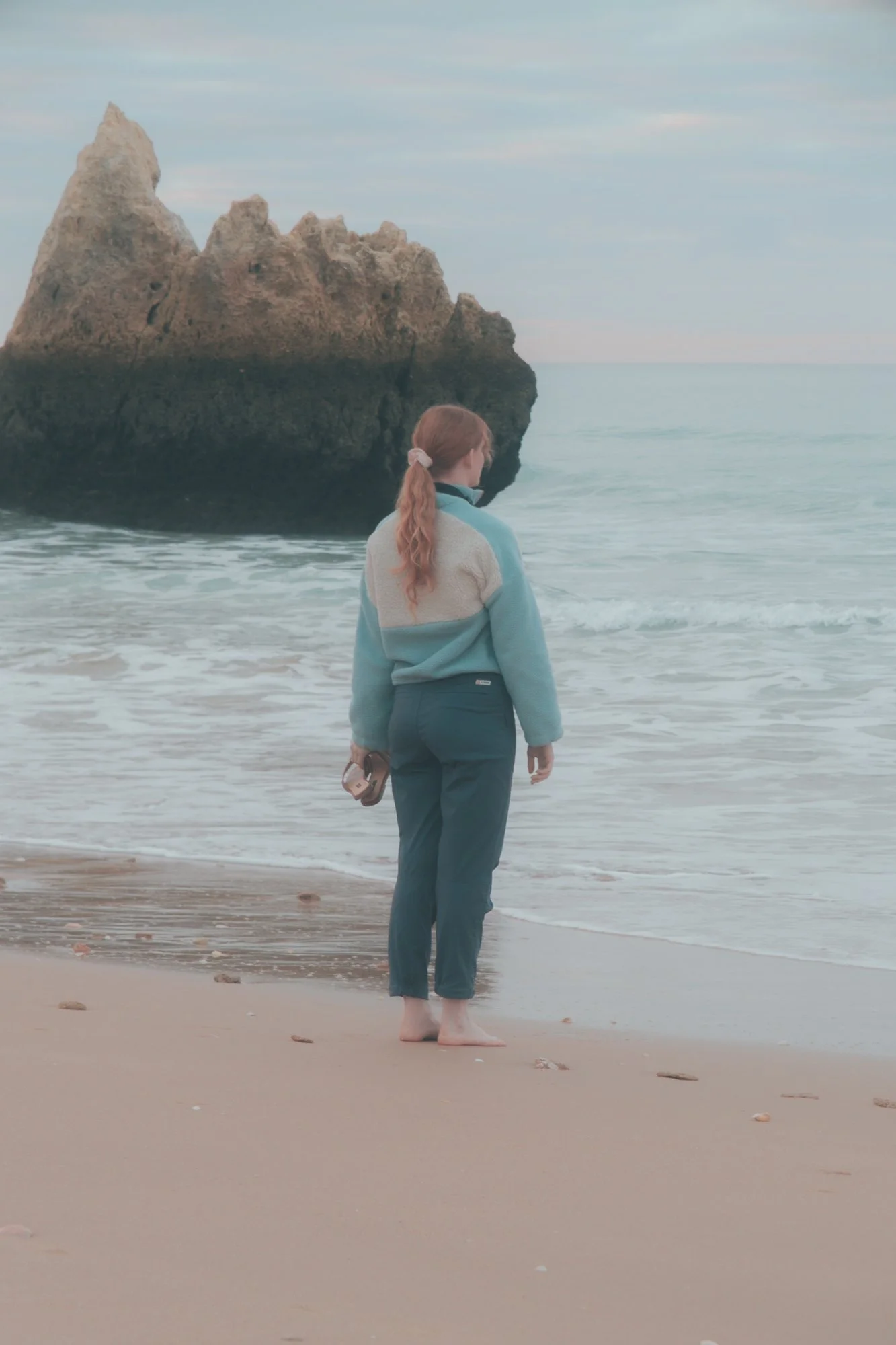 A woman with red hair tied in a ponytail, wearing a blue and white fleece jacket and teal pants, stands barefoot on a sandy beach, facing the ocean, holding a small camera in her right hand, with a large rock formation in the sea behind her.